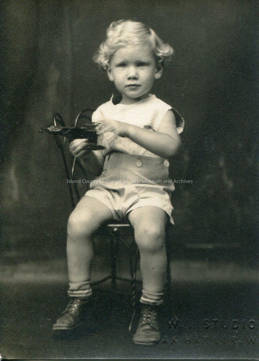 Digital copy only of a black & white portrait of Ron Van Dyk as a young boy with blond, curly hair sitting in a chair holding a toy. He is wearing a tee-shirt and shorts with suspenders, socks and shoes. No date or description.