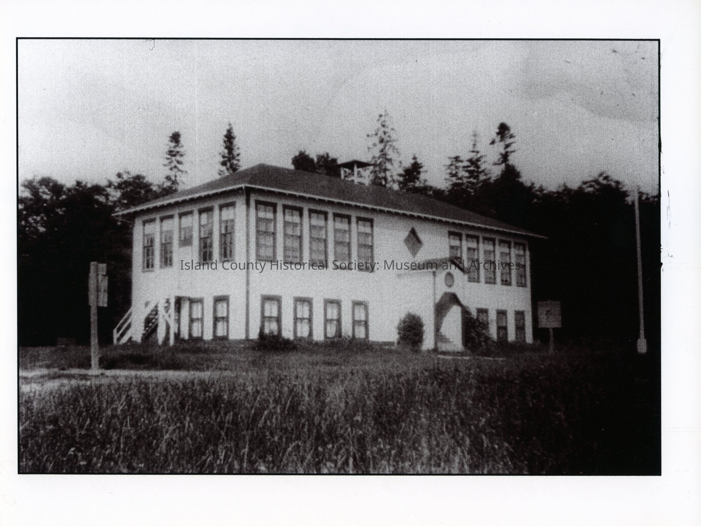 Unidentified school building. It is large, white, two story, with covered entryway and bell tower. On front, eight windows on ground floor and ten on second flor with a diamond window above the entry. Nine windows and fire escape on side. Two basketball hoops are outside.Lexicon