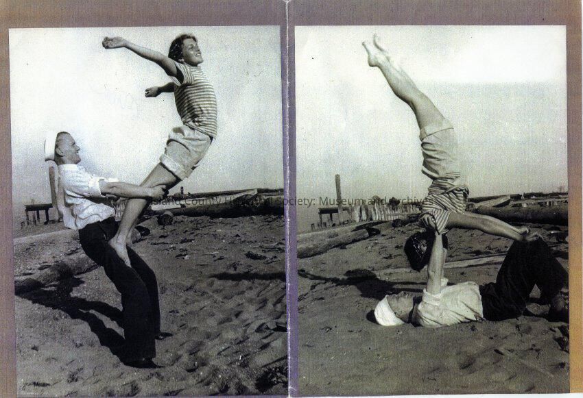 Virginia (Ginger) Bell and Ruth Bell Jacobson's husband Norm. Ginger is his sister-in-law. They are on Bells Beach with driftwood in the background. These two photos show Ginger and Norm horsing around with Ginger standing on Norm's thights. Norm is wearing dark pants, a t-shirt, and what looks like a navy dixie cup hat. Ginger is in shorts and a t-shirt.