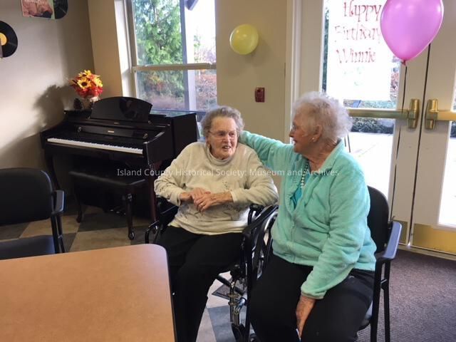 Winnie McLeods 98th birthday 2016 with Bonnie Bell Miller at Maple Ridge. Winnie sits in a wheelchair while Bonnie is in the chair next to her. Two balloons are seen behind the women and a piano is in th eback corner.