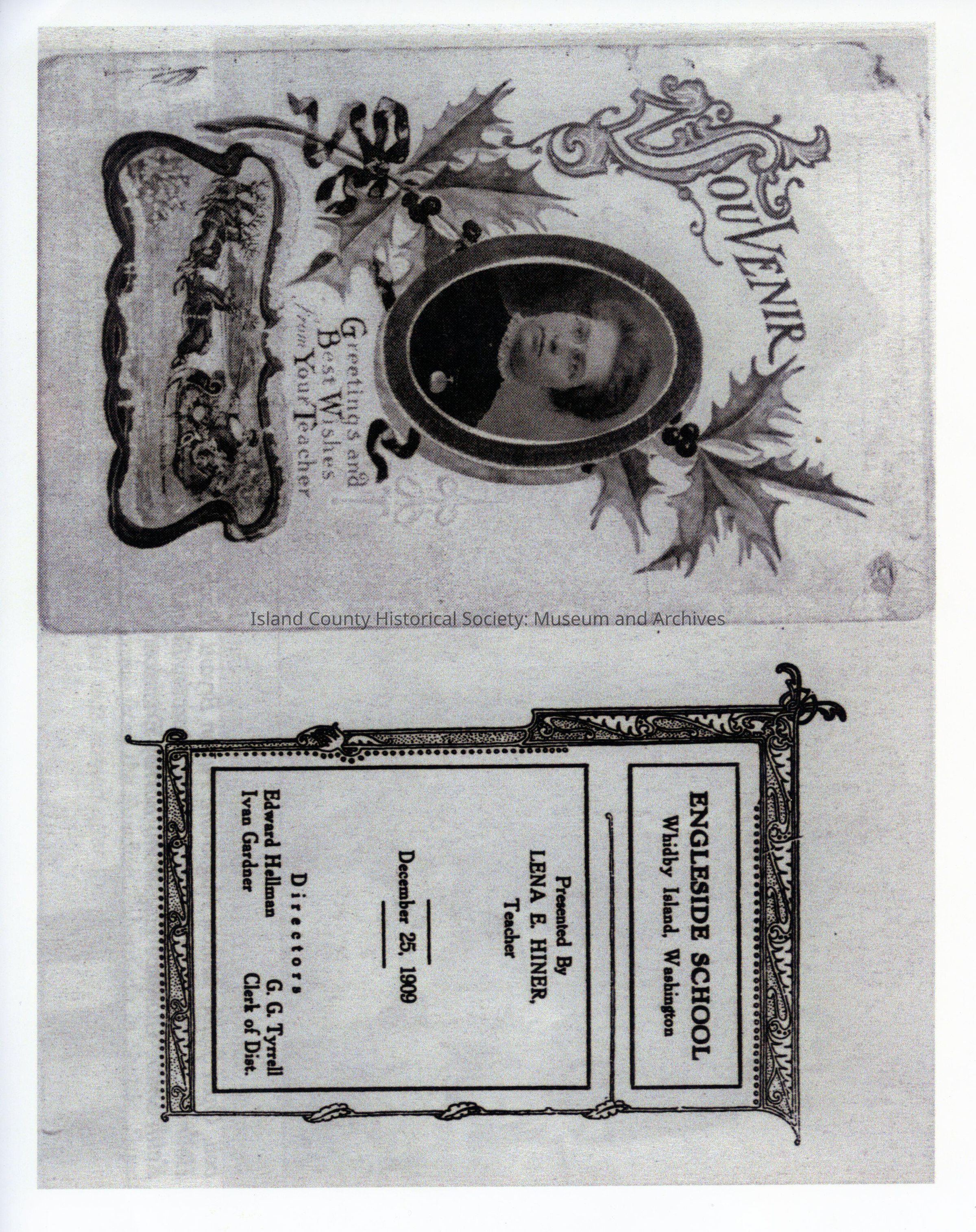Photo of Christmas card with picture of woman wearing glasses and high collar. Outside reads: Souvenir. Greetings and Best Wishes from Your Teacher. Inside: Engleside School, Whidby island, Washington. Presented by Lena E. Hiner, Teacher. December 25, 1909. DirectorsL Edward Hellman, Ivan Gardner, G.G. Tyrell, Clerk of District.Lexicon