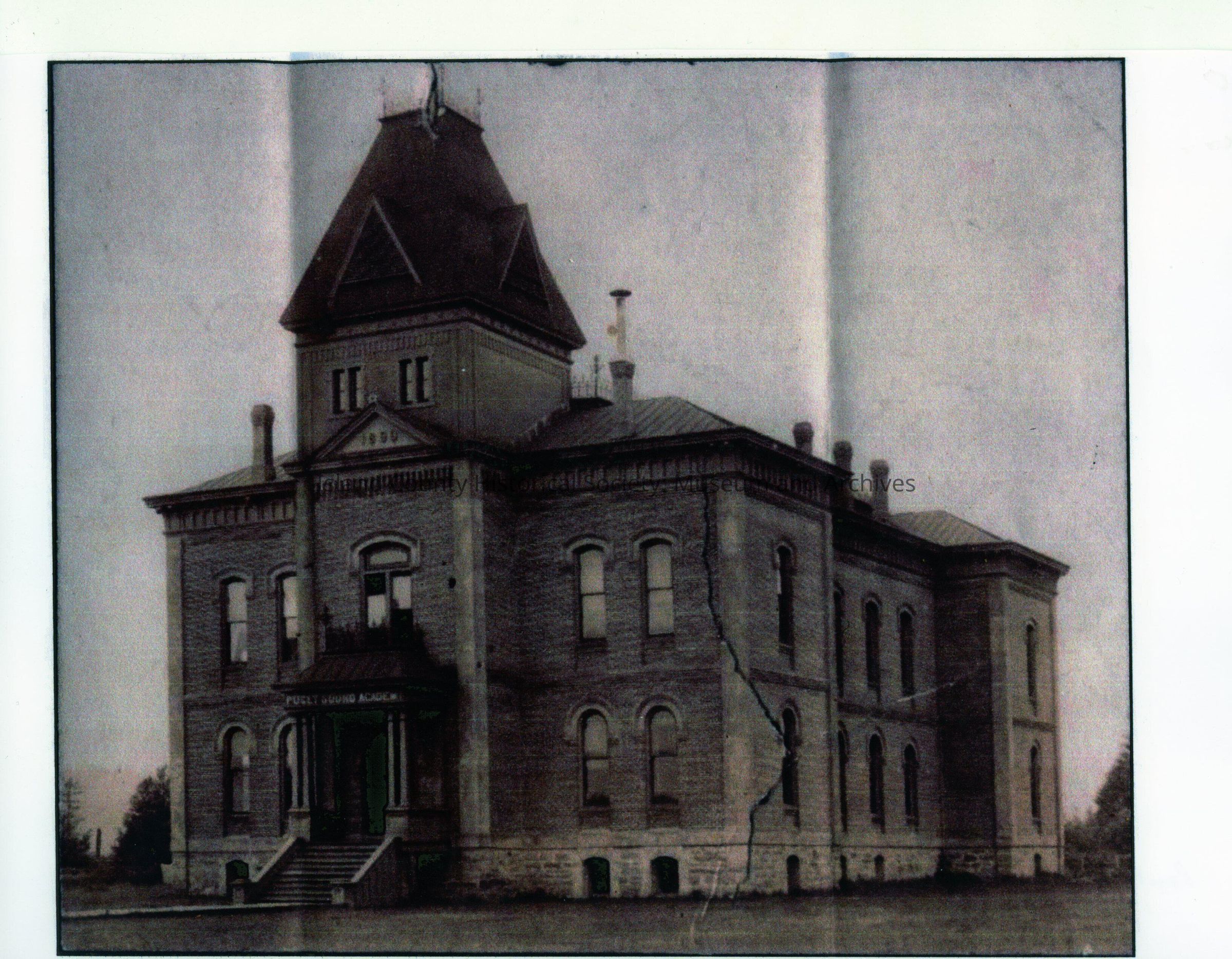 Large two story stone/brick building with a tower and many chimneys. Windows are rounded at top. Date at top is not fully legible but appears to be 1890 or 1899. Sign over front door reads Puget Sound Academy, which moved from Coupeville to Snohomish in 1890's.