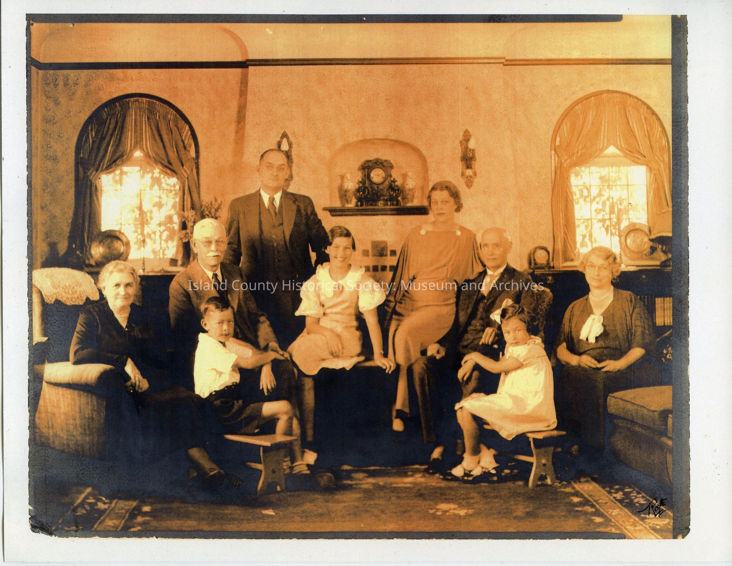 In this photo several family members of Puget Race's family pose for a family portrait. On the back of the image it list that they are in the Home of W.P. Race in 1852 and list the name and relation of person in photo.
