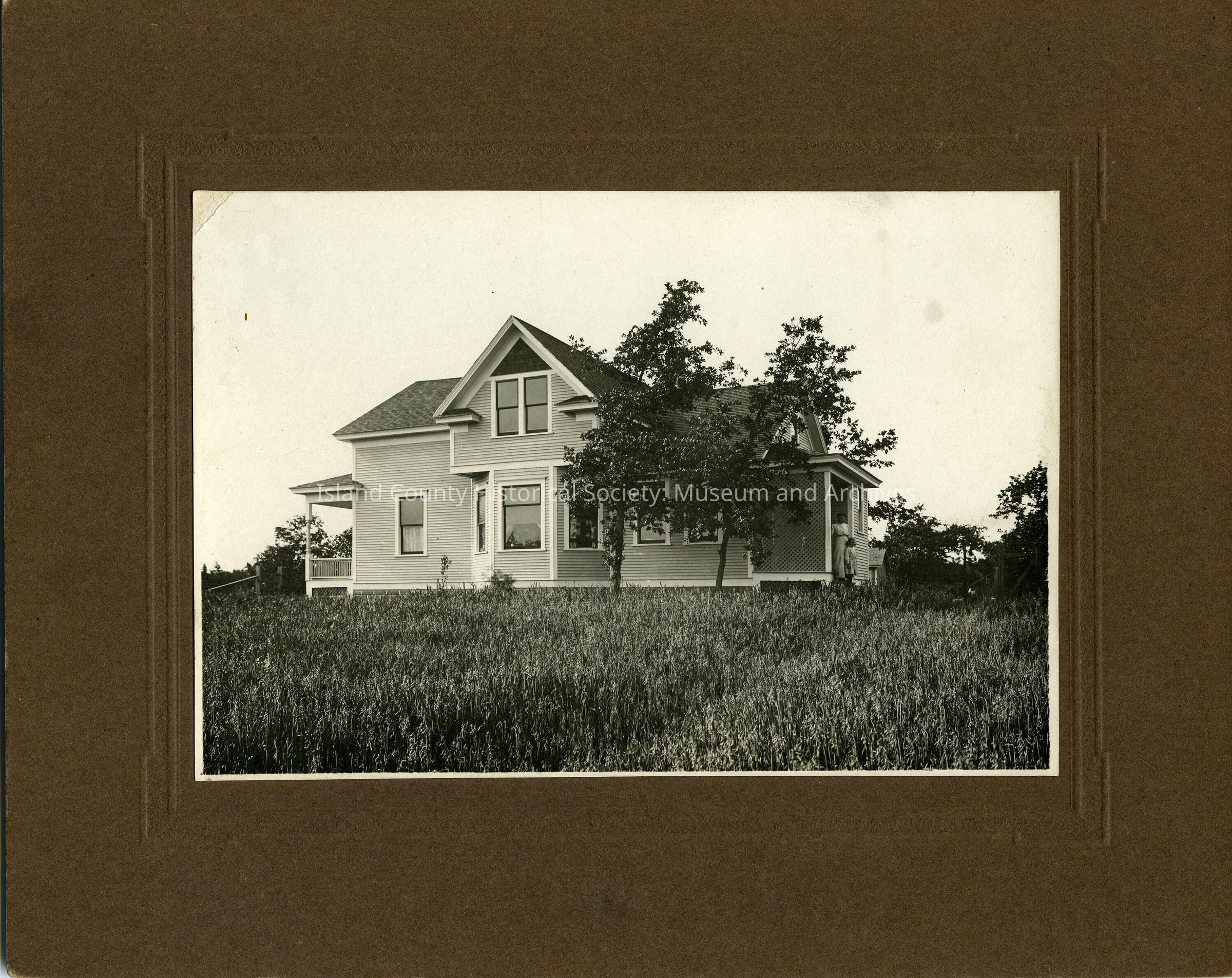 Frank Stallmon home built in 1911. Two story home set on the edge of an agricultural field. A woman and child are standing on the back porch.