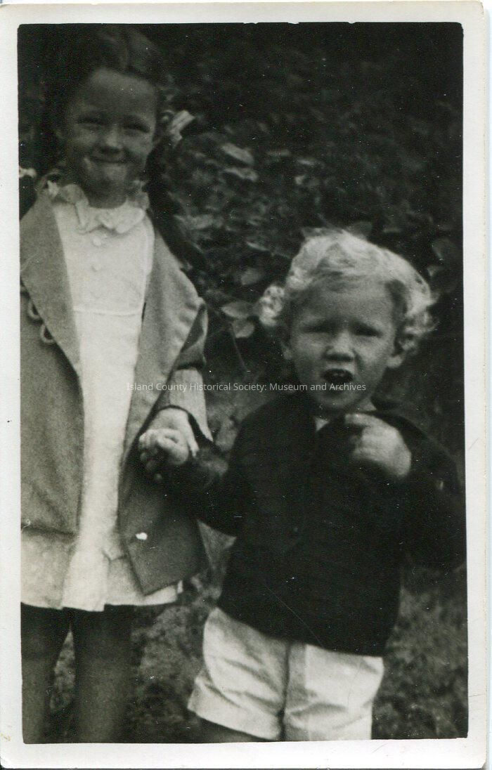 Digital copy only of a black & white photo of a little girl holding hands with Ron Van Dyk. They are standing in a garden. Ron is a toddler with curly, blond hair and is wearing a long sleeved dark shirt and shorts. The little girl has long, dark, braided hair with bows and is wearing a light colored dress and a jacket. No date or description.Made/Created