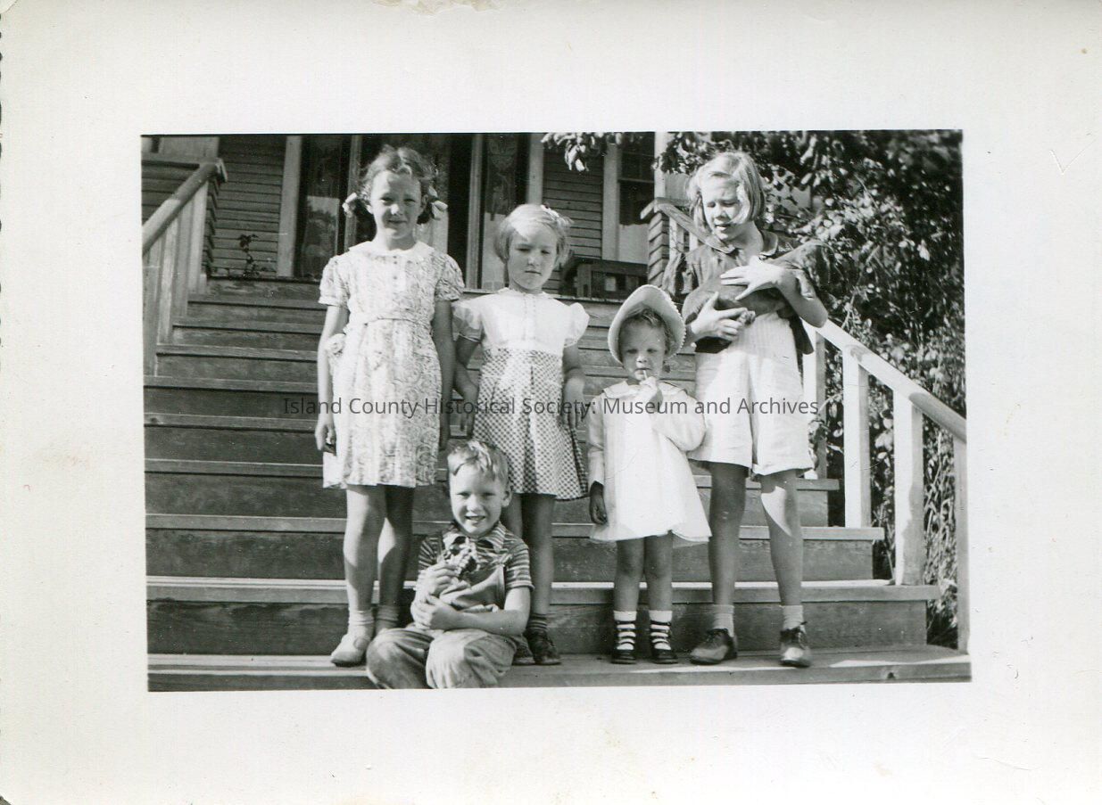 Digital copy only of a black & white photo of four young girls and one boy on a staircase in front of a house. The boy is Ron Van Dyk at about 4 or 5. He is sitting on a step and the four girls are standing behind him. Ron is wearing a striped, short sleeve poloshirt and overalls. The three girls on the left are wearing dresses and the girl on the far right is wearing shorts and she is holding a puppy. The youngest girl is about 2-3 and is wearing a bonnet. No date or description.
