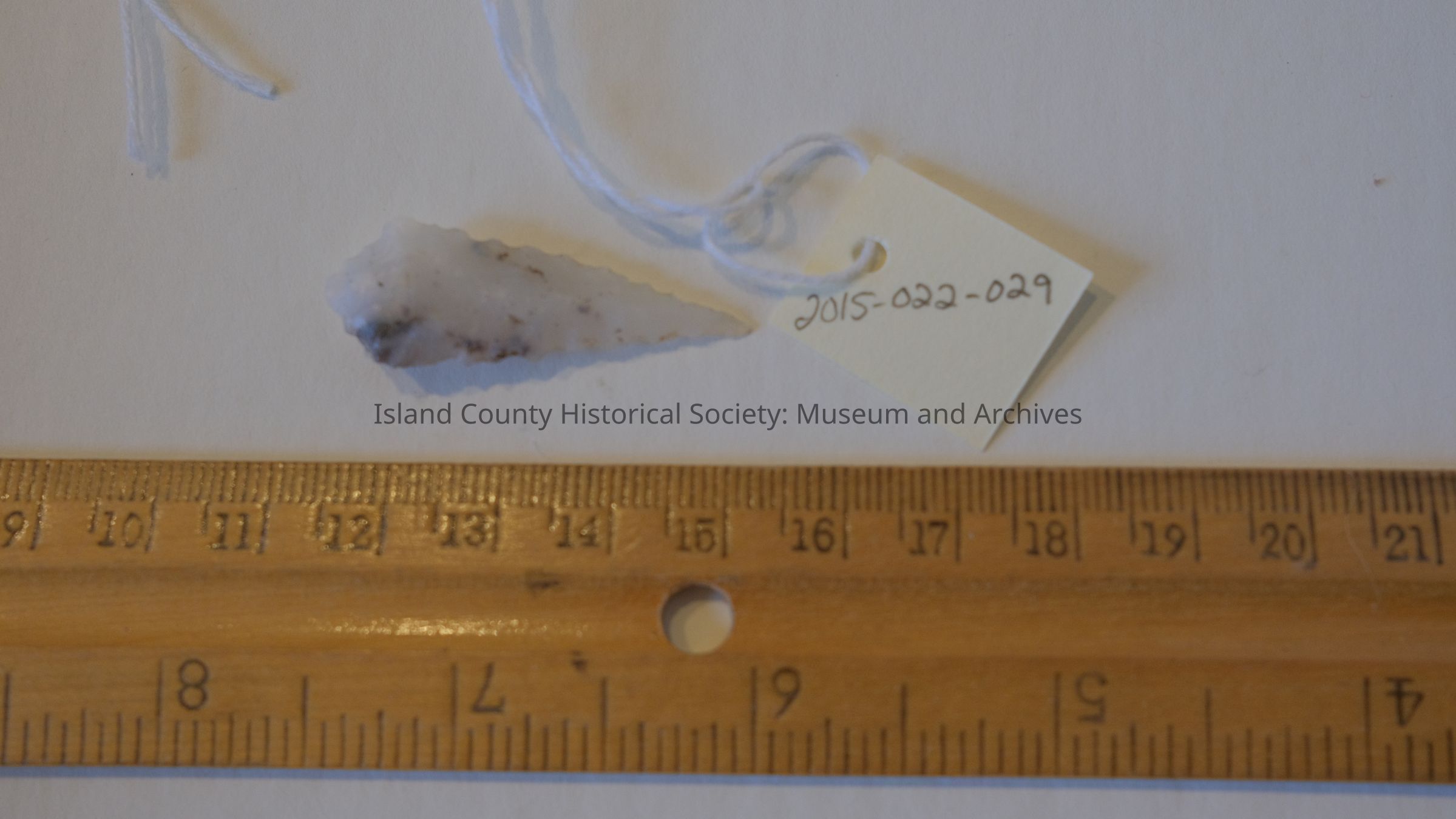 projectile point, mostly white with some dark brown flecks