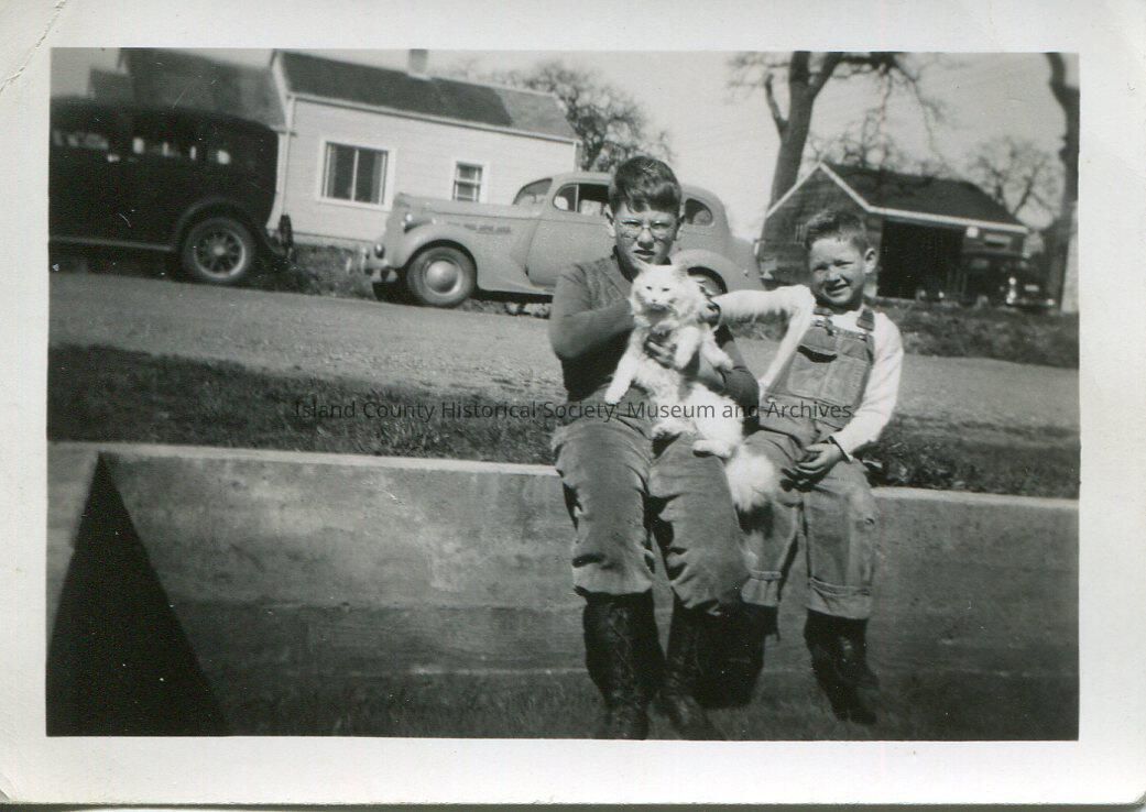 Digital copy only of a black & white photo of two boys sitting on a concrete wall with a street and 1930-1940s cars behind them. The boy on the left is Ron Van Dyk. He is wearing glasses, a sweater, long pants, and high laced boots. He is holding a white long-haired cat. The boy on the right is wearing a long sleeved shirt, overalls, and boots. No date or description.Made/Created