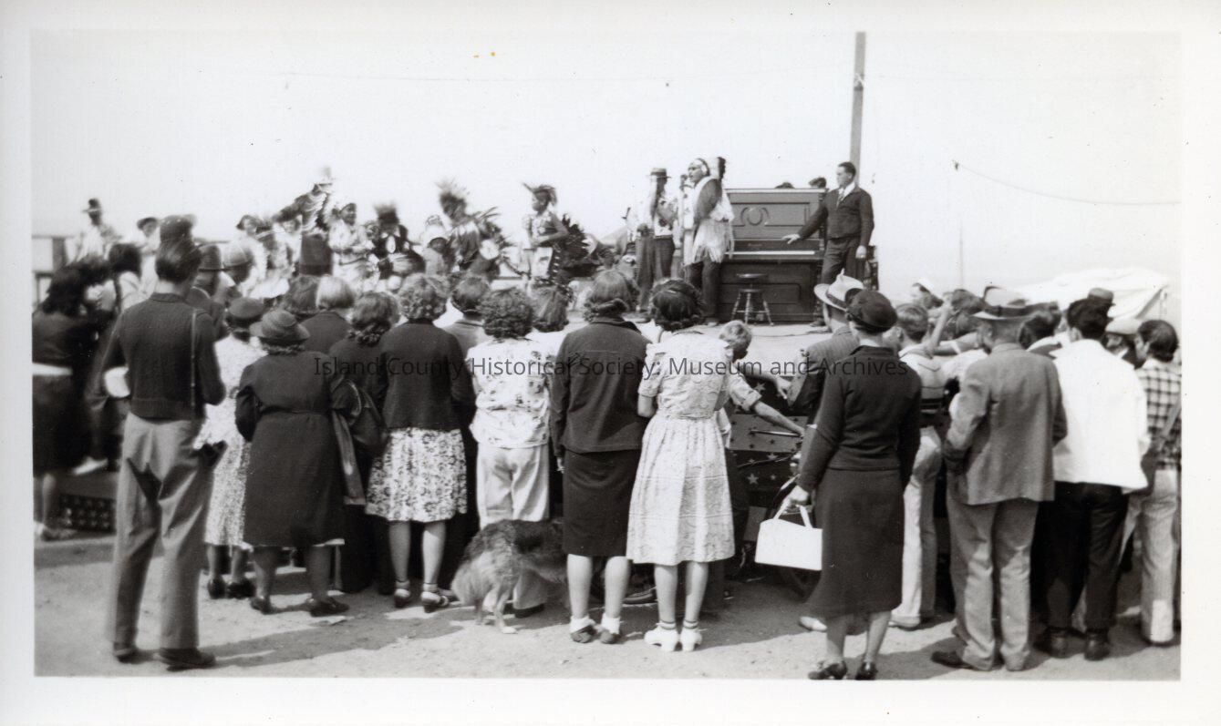 Black and white photograph of an event during a water festival (1939 most likely- see other 1939 water festival pictures). Three Native American women in ceremonial dress dance upon an outdoor stage before an audience. On the far right is a piano where a Native American man stands thumping on a drum. People on the stage sit on benches or chairs around the dancers, whilst the rest of the audience stand on the ground below the stage (the backs of their heads in the foreground of the photo). Off center towards the left of the photo stands a long thin pole, its base not visible.Collection