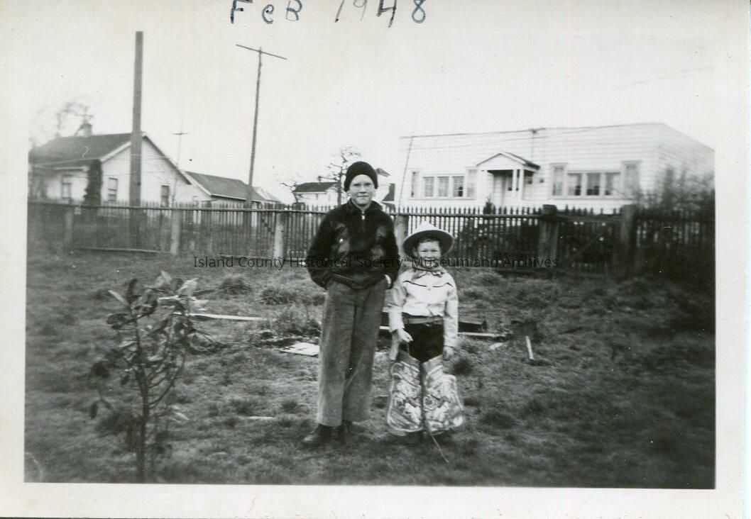Digital copy only of a black & white photo of two boys standing in a grassy lot with a wood fence in the background and houses beyond the fence. The boy on the left is Ron Van Dyk. He is wearing glasses, a beenie hat, sweater and long pants. His hands are in his pockets. The boy on the right is wearing a cowboy hat, cowboy shirt, and chaps. Feb 1948 is handwritten on the top of the photo.Made/Created
