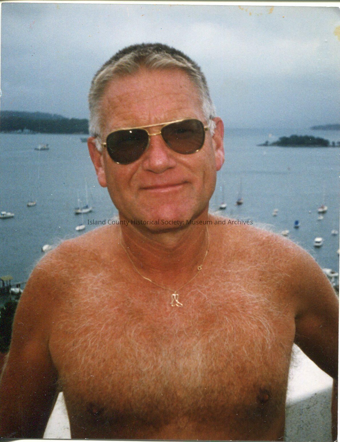 Digital copy only of a color photo of a barechested Ron Van Dyk with a crewcut and sunglasses. He appears to be in his 50s or 60s. There are boats on the water in the background. No year or description.