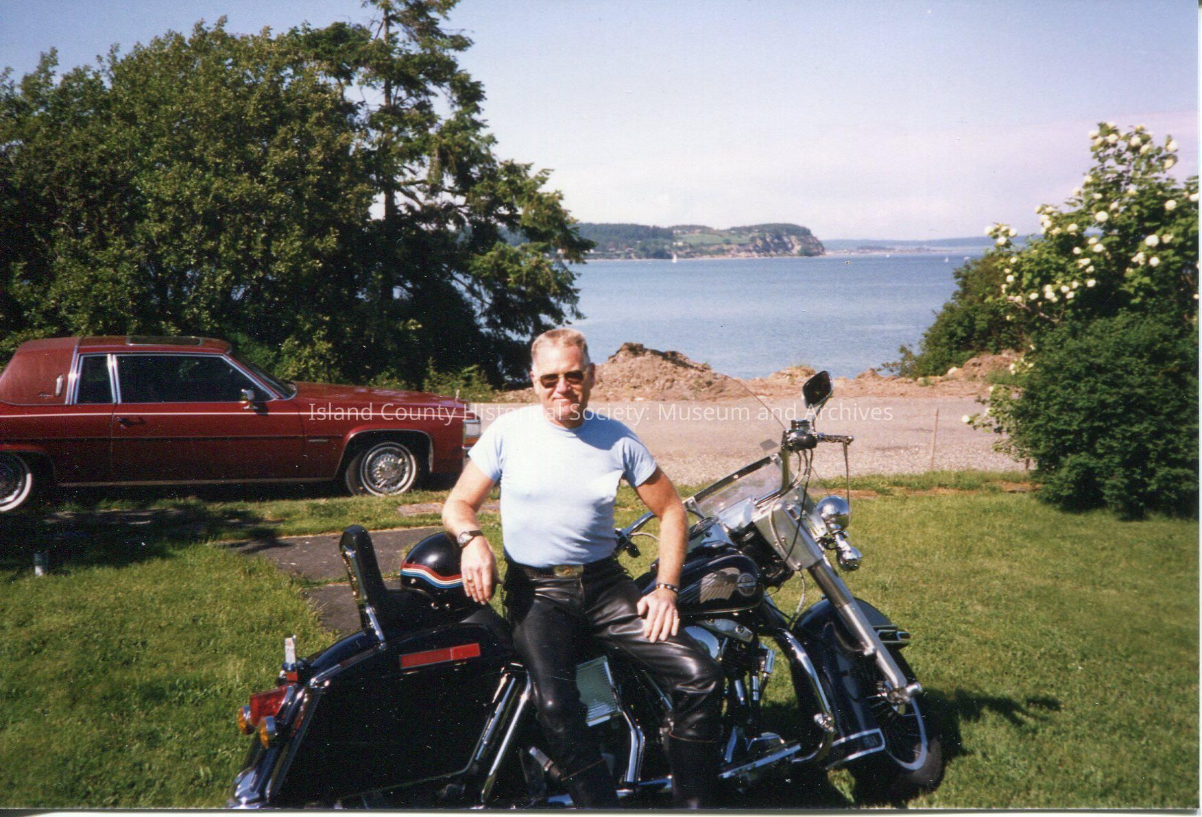 Digital copy only of a color photo of Ron Van Dyk sitting on his motorcycle on a lawn. He appears to be in his 60s. He is wearing sunglasses, a blue tee-shirt, and black leather pants. There is a red car and water in the background. No year or description.
