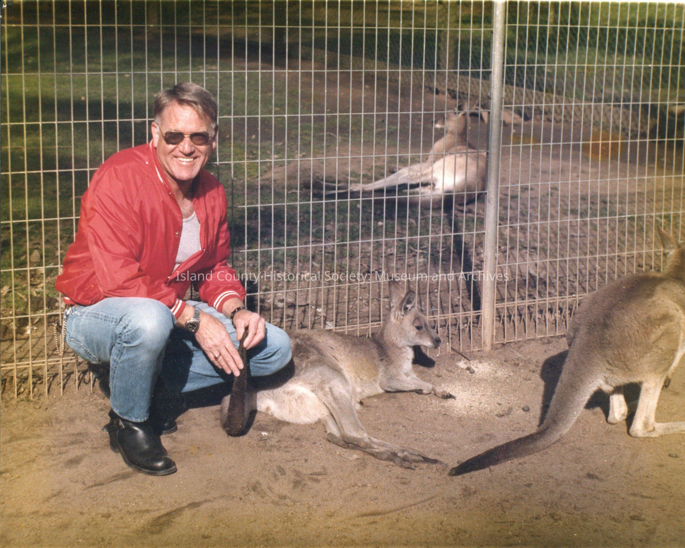 Digital copy only of a color photo of Ron Van Dyk in a fenced area with several kangaroos. He is wearing sunglasses, a red jacket and jeans. No year or description.