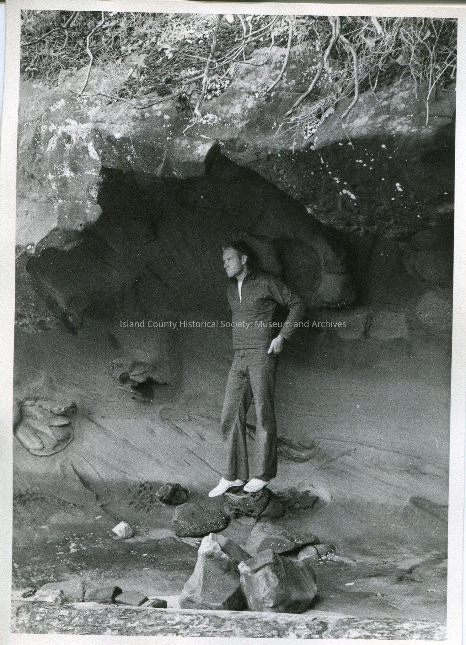 Digital copy only of a black & white photo of Ron Van Dyk standing in a cave. He is wearing white sneakers, dark pants and a dark jacket. No year or description.