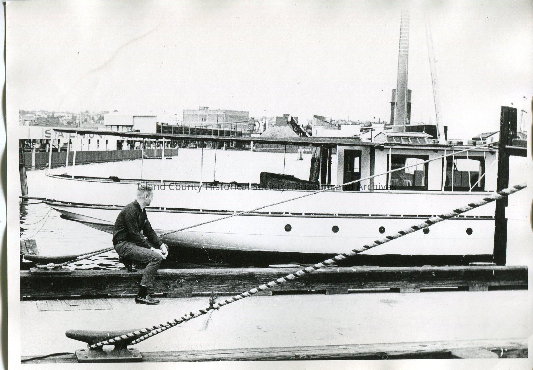 Digital copy only of a black & white photo of Ron Van Dyk sitting on a dock looking at a power boat moored behind him. He is wearing a long sleeved dark shirt and dark pants. No year or description.