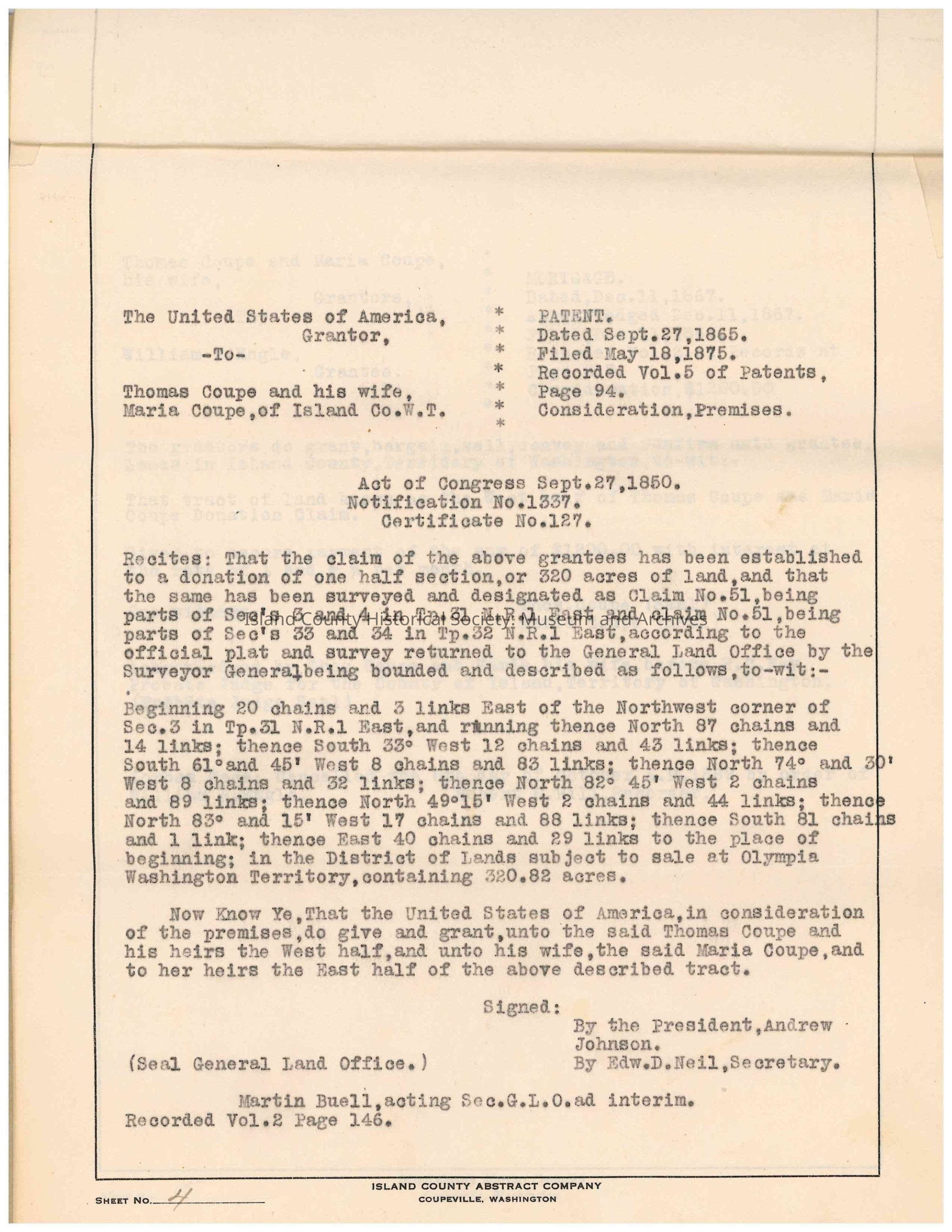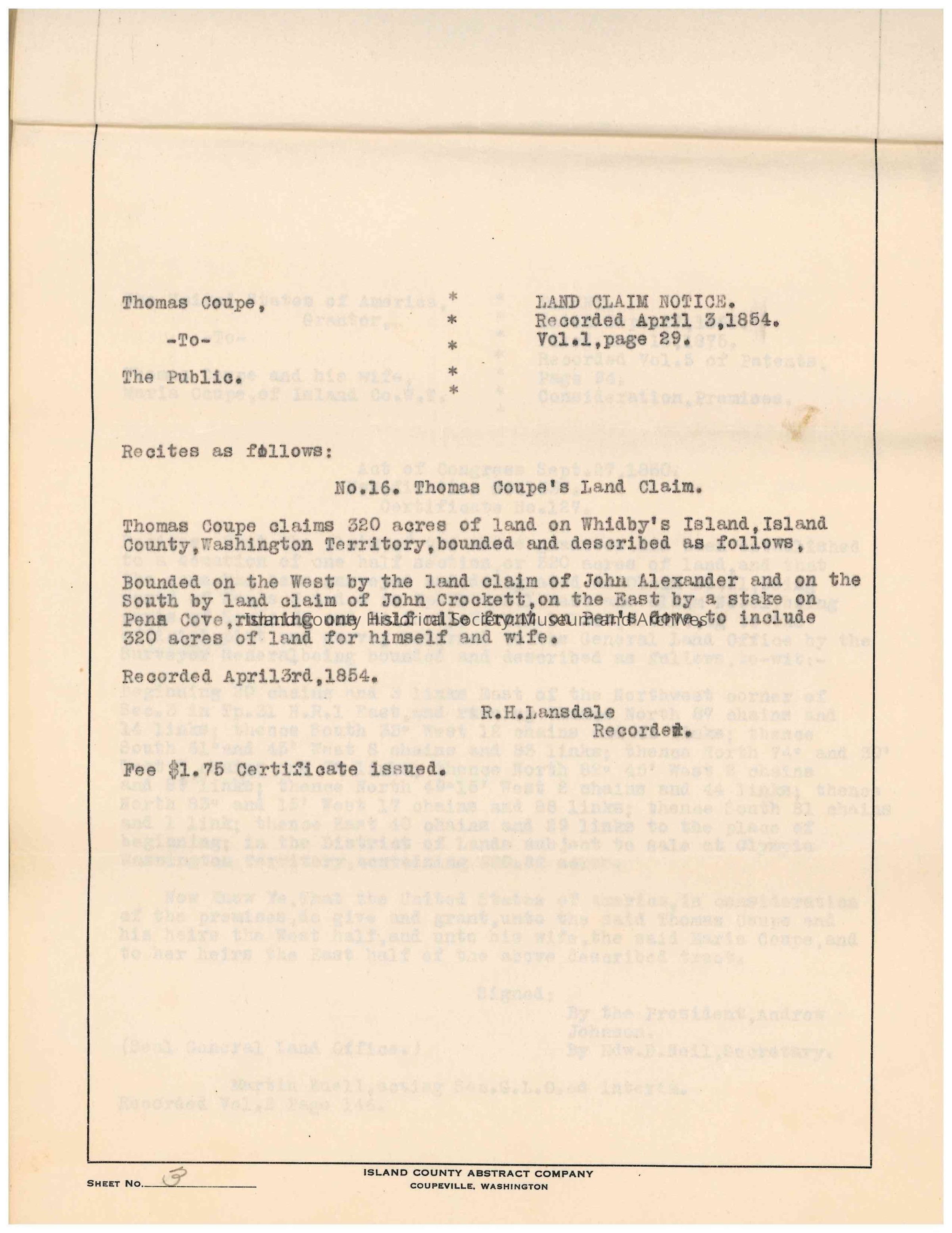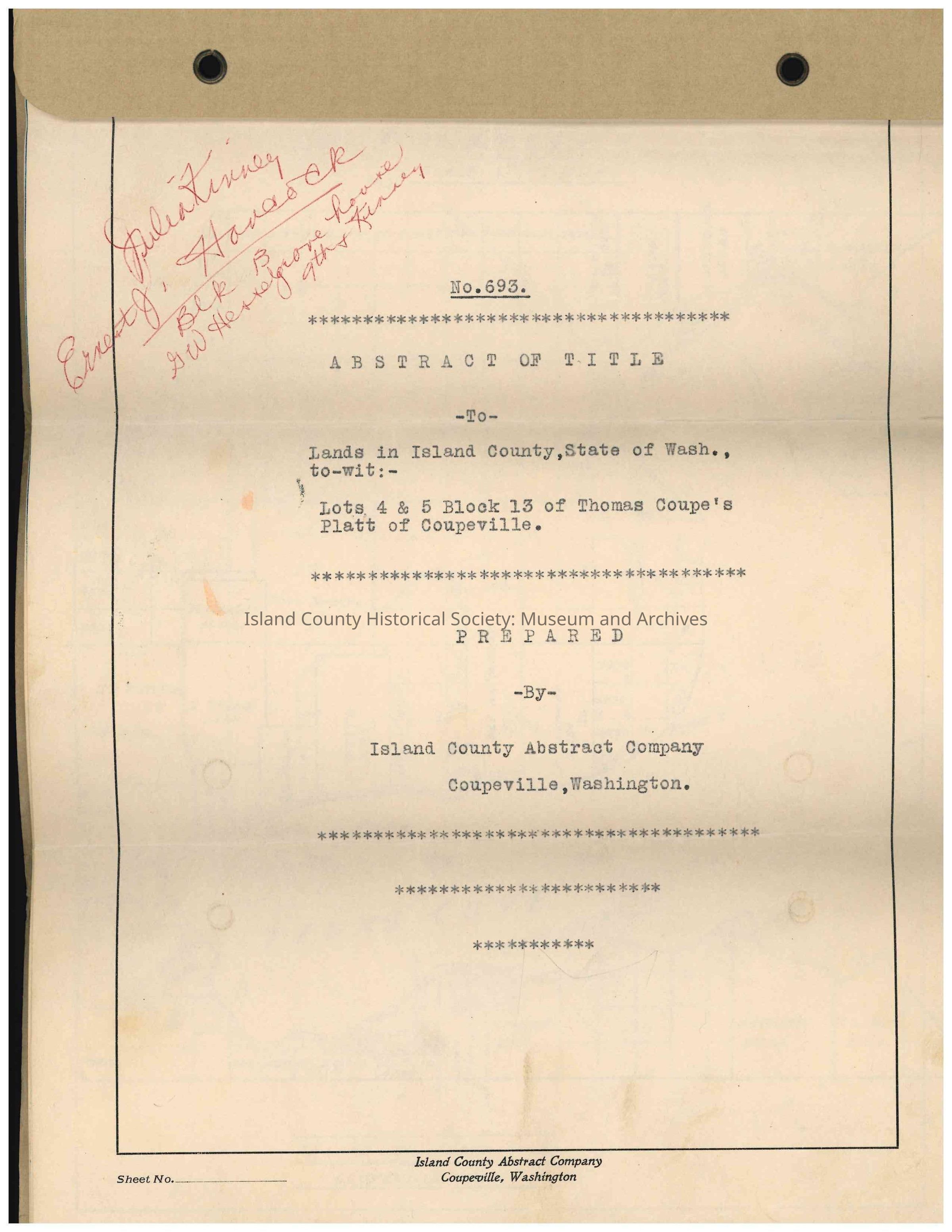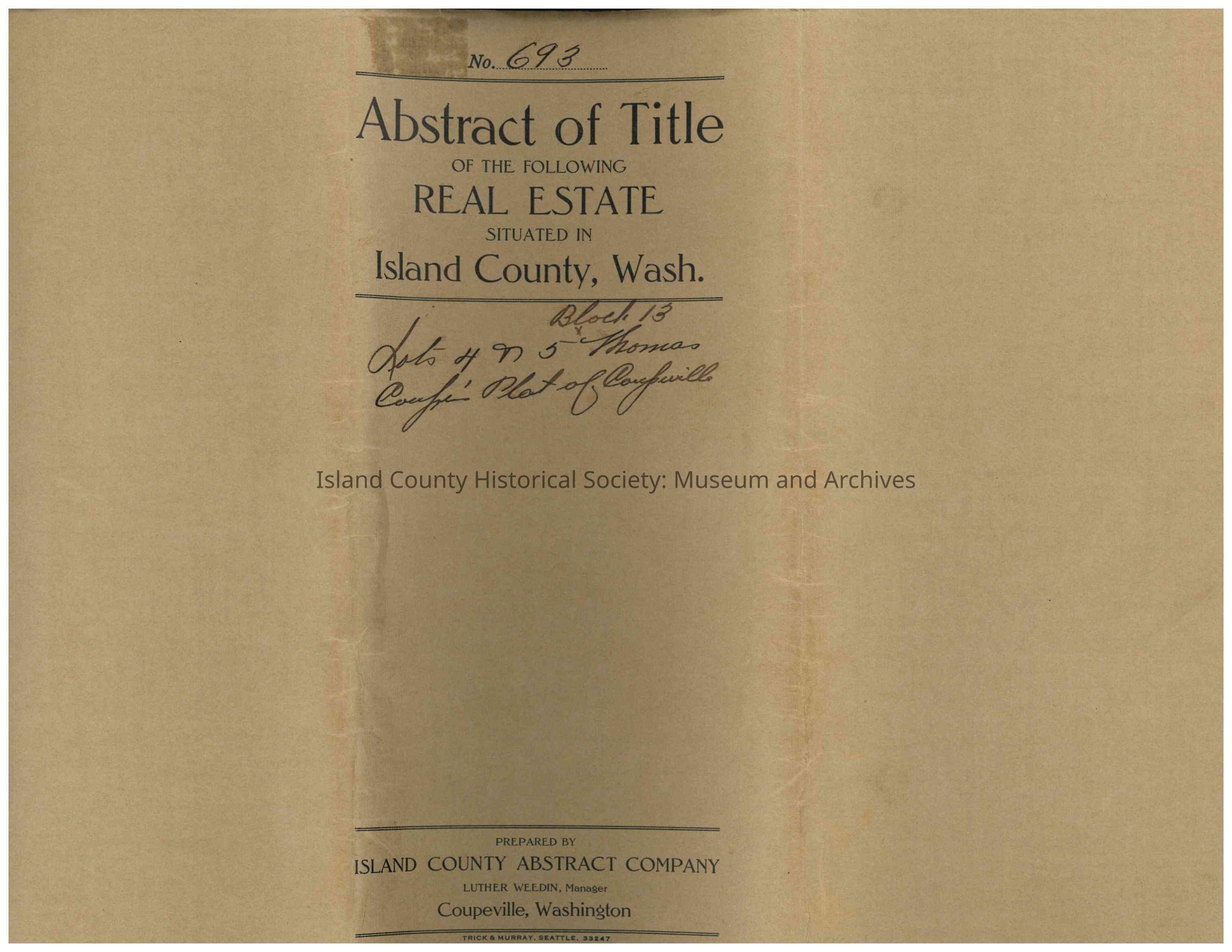 Abstract of title for "Lots 4 & 5, Block 13 of Thomas Coupe's Platt of Coupeville" in Island County.