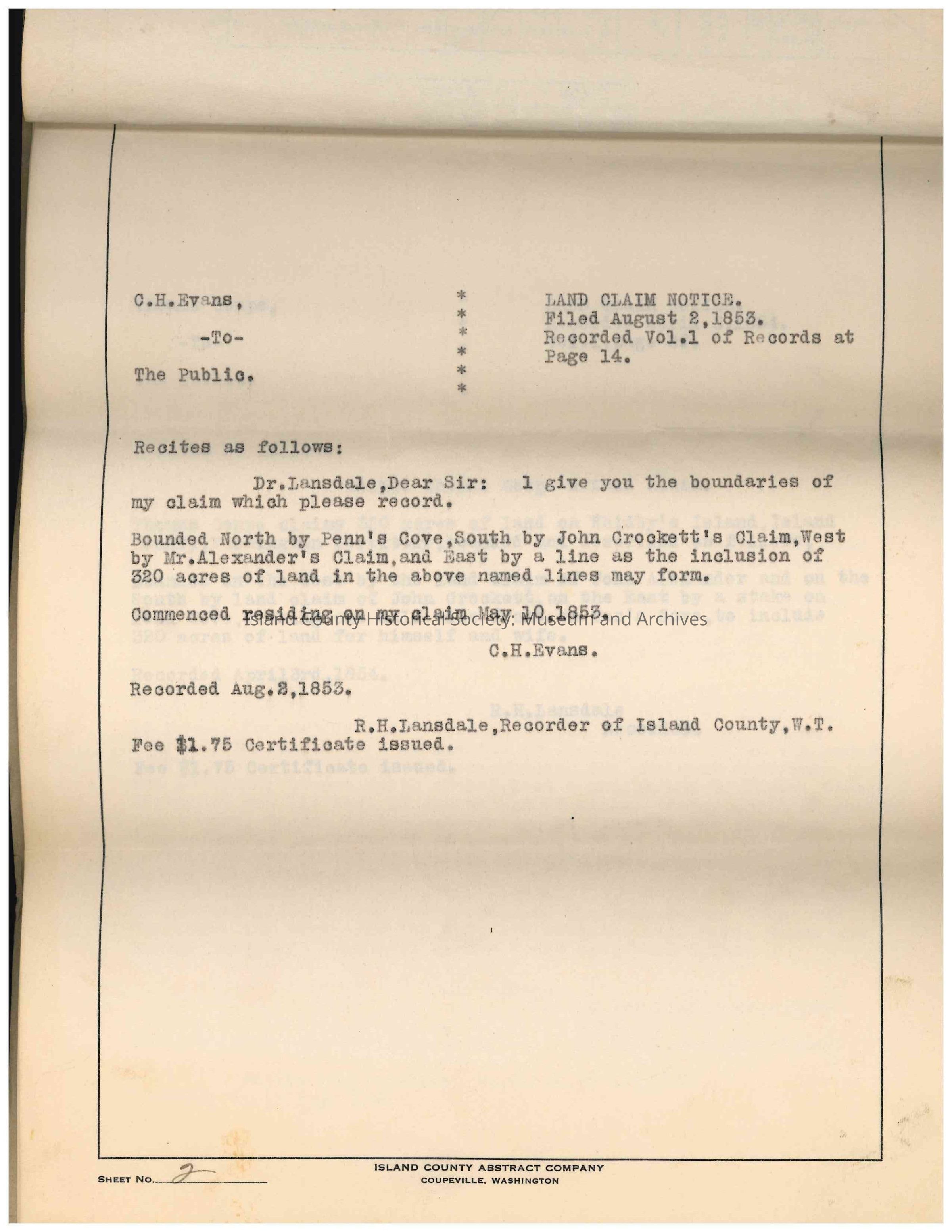 The first patent record for this portion of land is attributed to C.H. Evans, recording his land claim to R. H. Lansdale, filed 02 August 1853. Thomas Coupe's land claim follows.