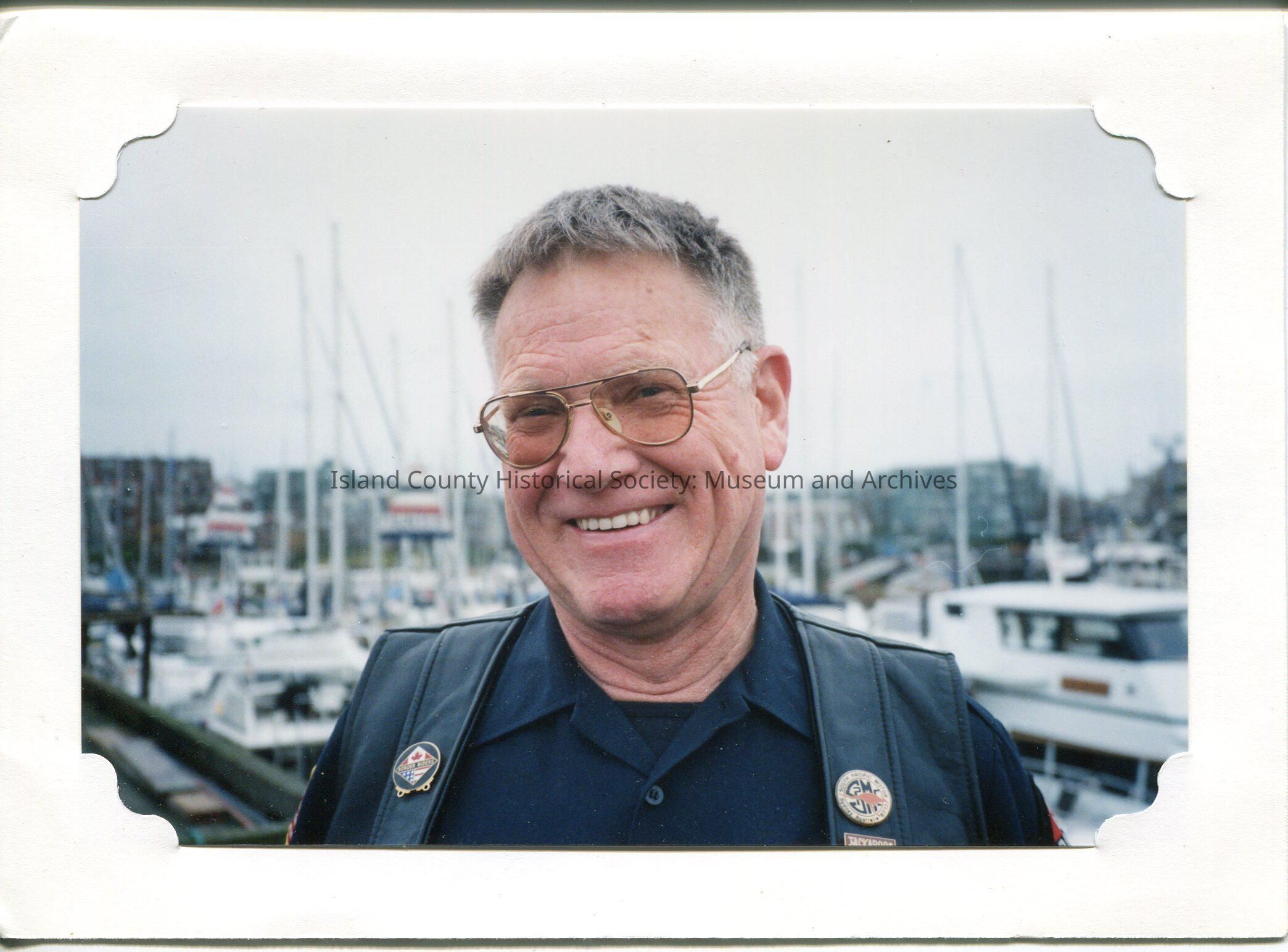 Digital copy only of a color photo of Ron Van Dyk, perhaps in his 70s. He is wearing glasses, a blue shirt and a vest with two button insignias. There is a marina behind him. No year or description.