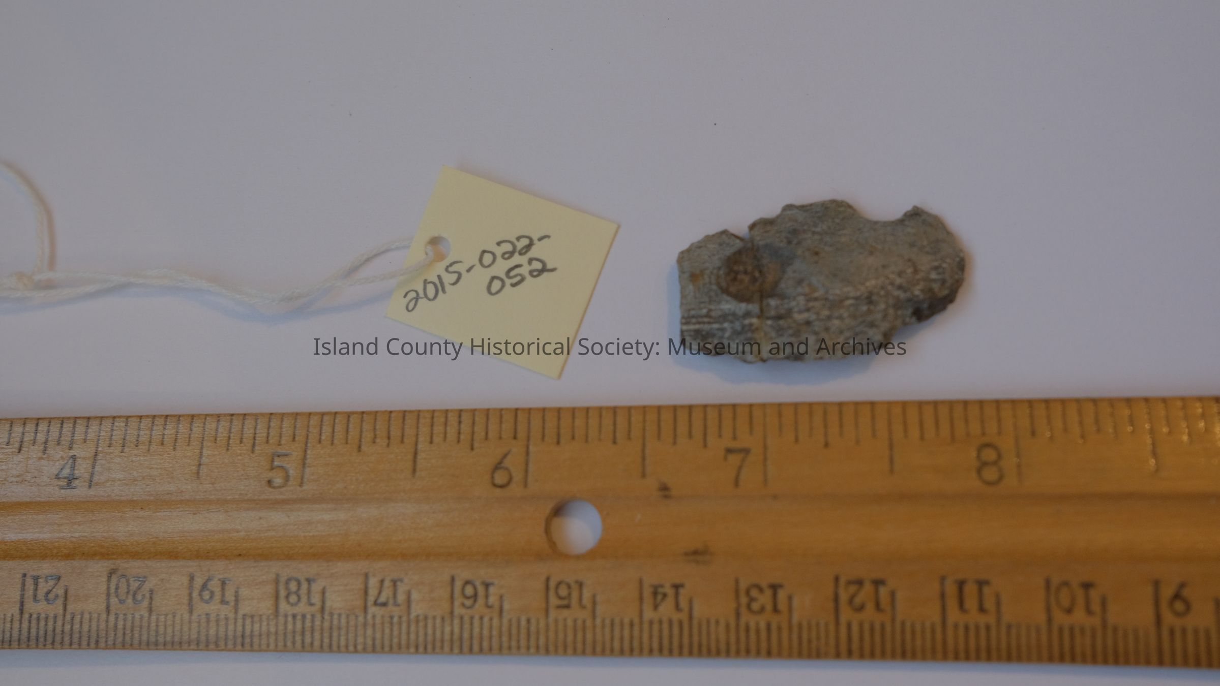 projectile point - grey in color - tip is broken off - also appears broken in half and glued back together.