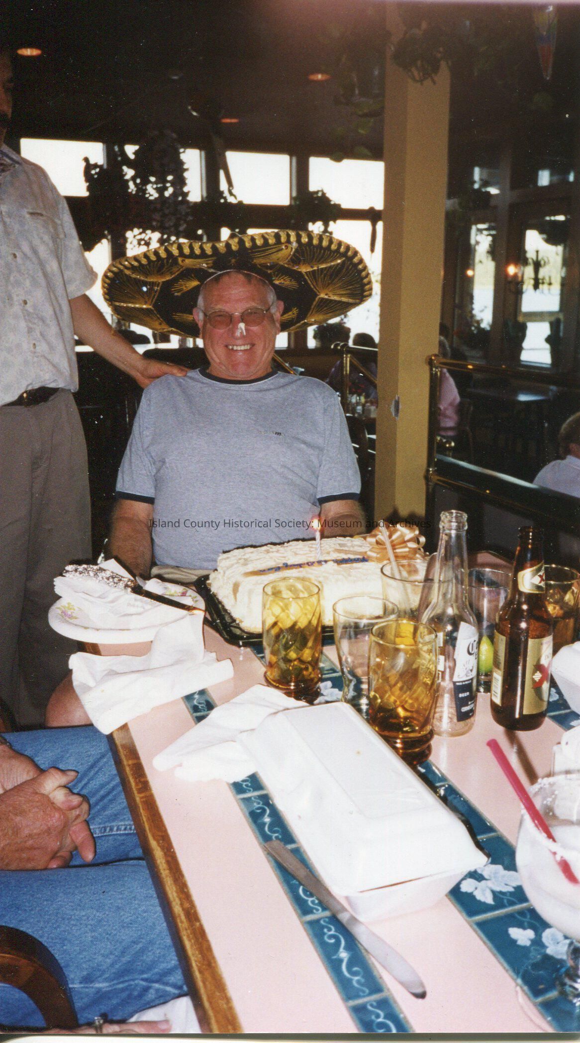 Digital copy only of a color photo of Ron Van Dyk sitting at a table in a restaurant with his birthday cake in front of him. He is wearing a big smile, a sombrero and a blue tee-shirt. He has whip cream on his nose. No date or description.