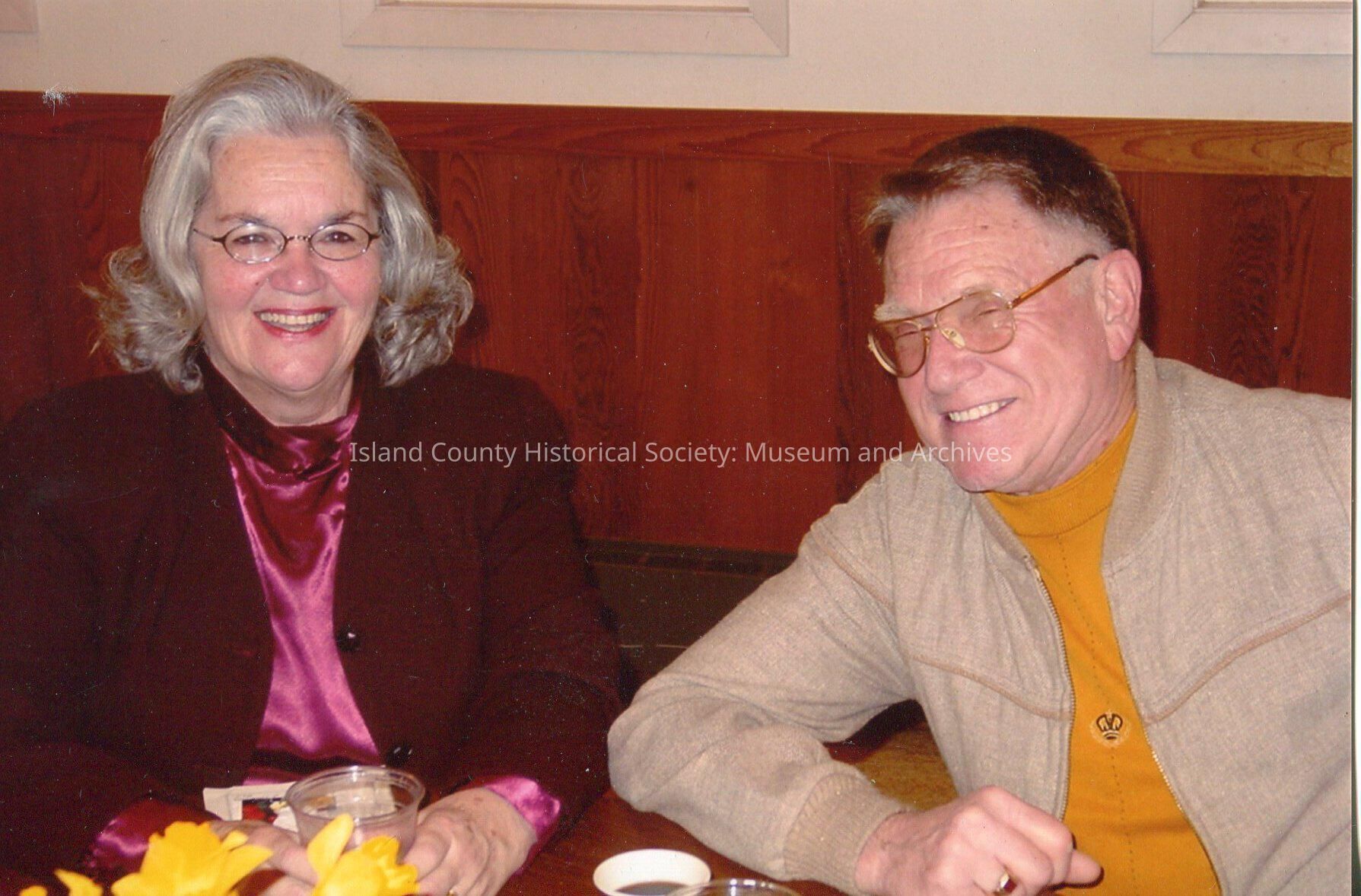 Digital copy only of a color photo of Ron Van Dyk as a middle-aged man sitting at a table with a middle-aged woman. The woman is on the left and she has medium length gray hair and glasses. She is wearing a cranberry blouse and blazer. Ron is wearing a gold turtleneck and a tan jacket. No date or description.