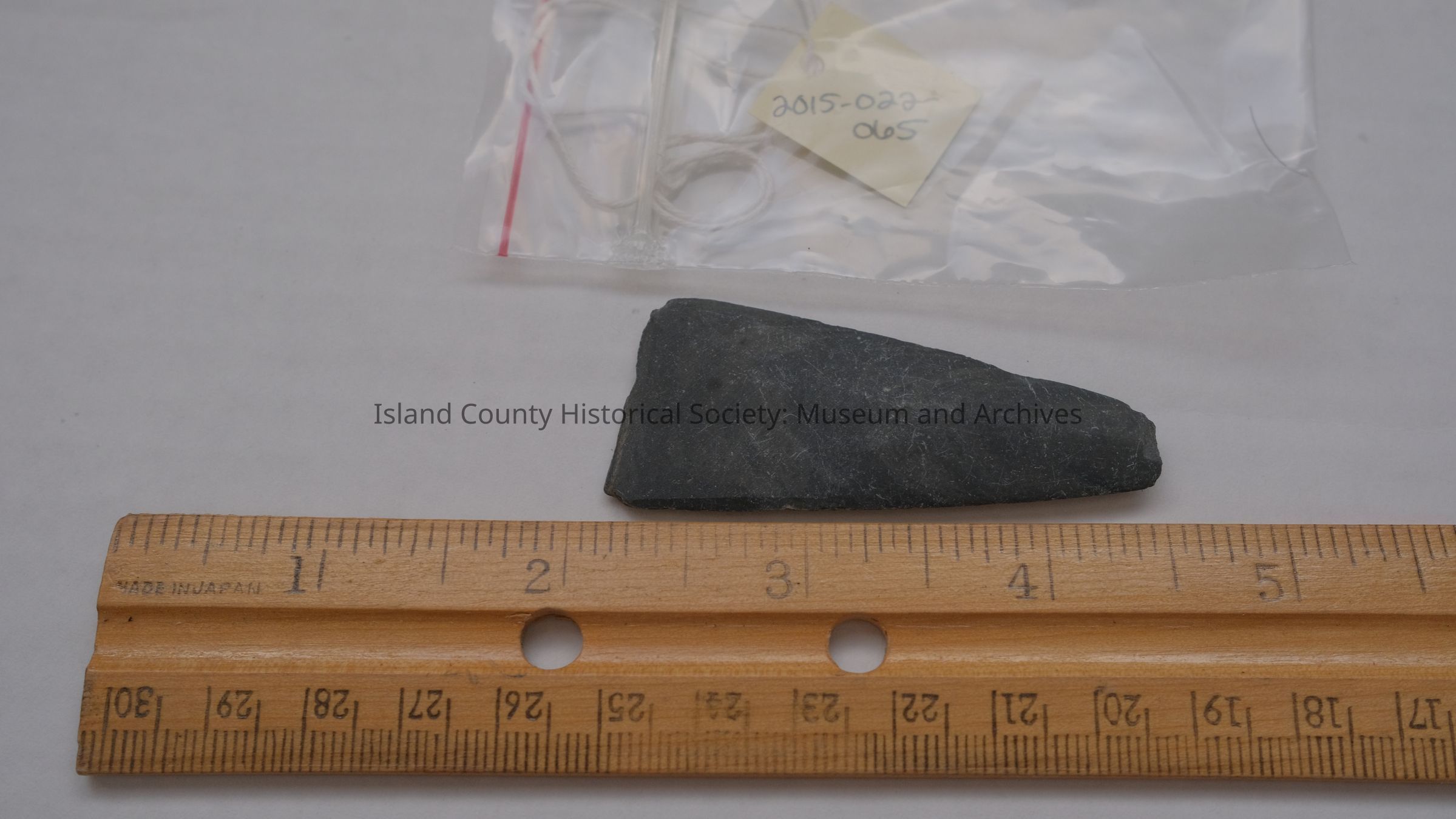stone tool scraper - triangular in shape - dark grey in color - all three edges beveled & smoothed