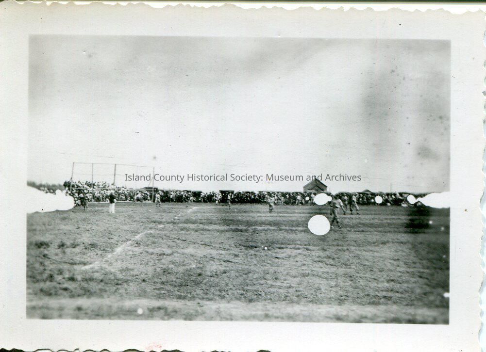 Digital copy of a black & white photo of a baseball game. The baseball players are in the foreground. People are in the stands behind the backstop. Appears to be the same setting as the baseball game in 2017.076.081. No description or date.