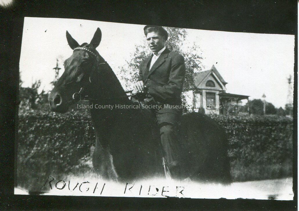 Digital copy of a black & white photo of a man ridng a horse. The man is wearing a suit & cap. A hedge and house is in the background. Hand written on the photo is "Rough Rider". No description or date.