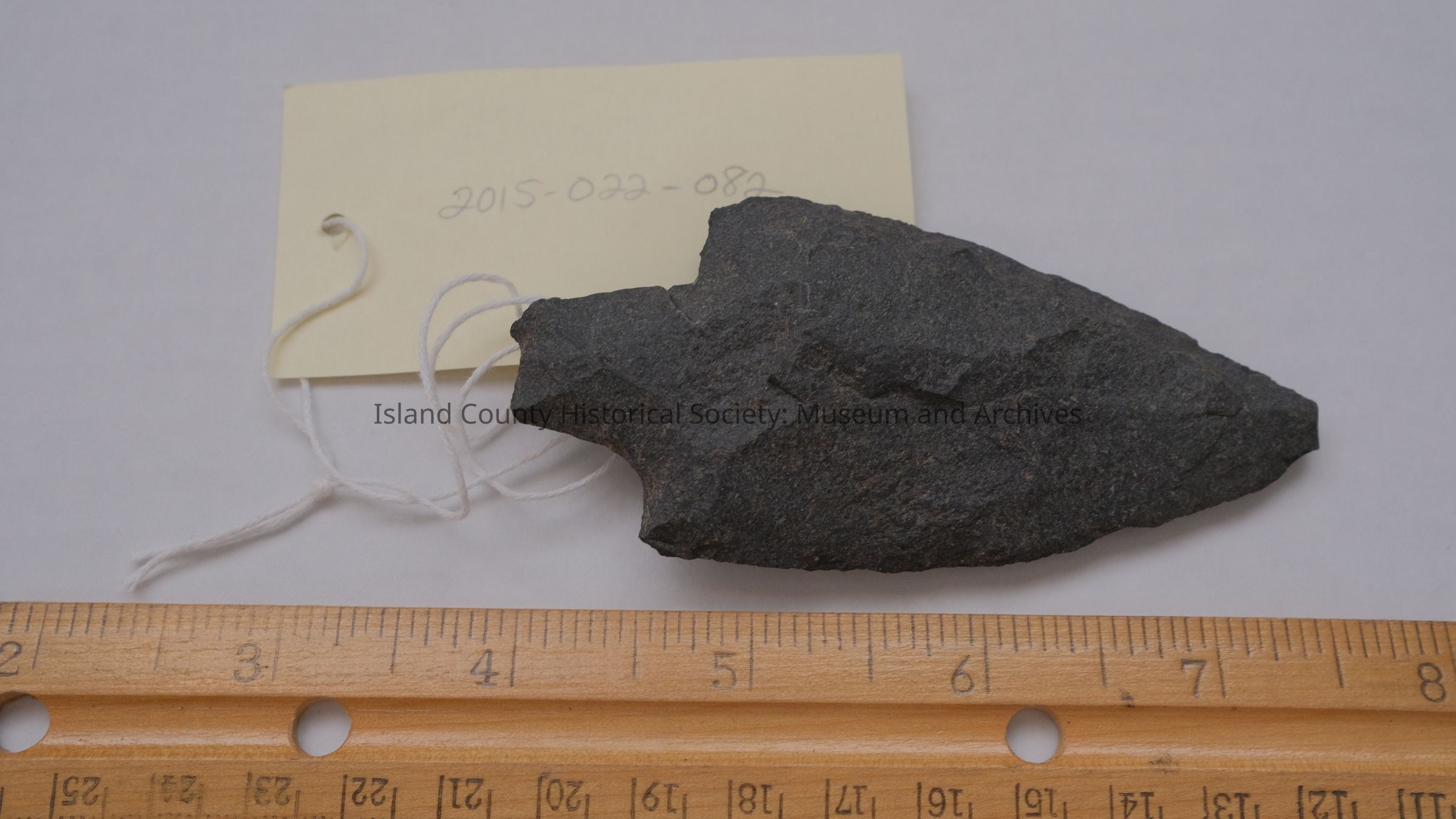 basalt projectile point. slightly contracting stem with straight base and triangular blade. not an even sided point as one notch is much more in set than the other.