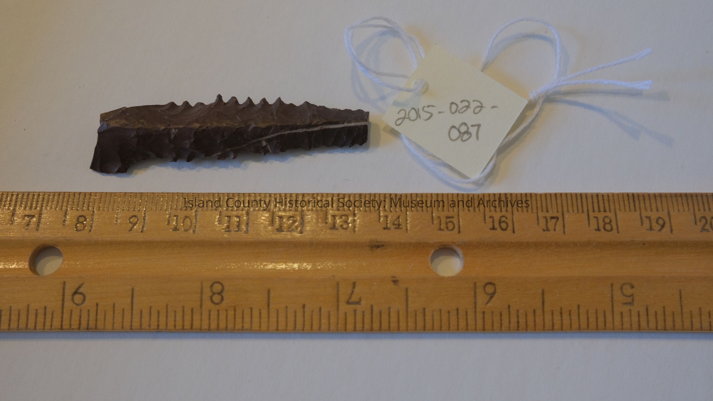 stone projectile point, dark brown in color, edges of enlongated triangular shaped blade are serrated, tip & part of base and shoulder are broken off.Lexicon