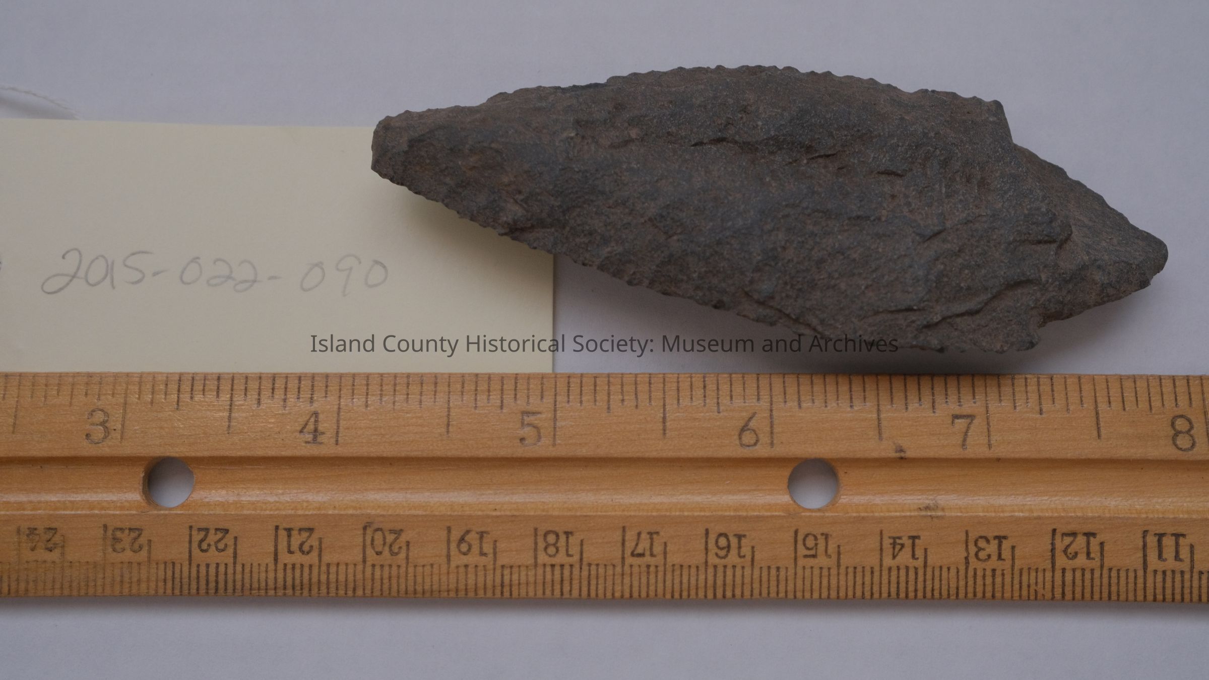 basalt projectile point. triangular shaped blade with contracting base appearing to be broken and very slight shoulders.