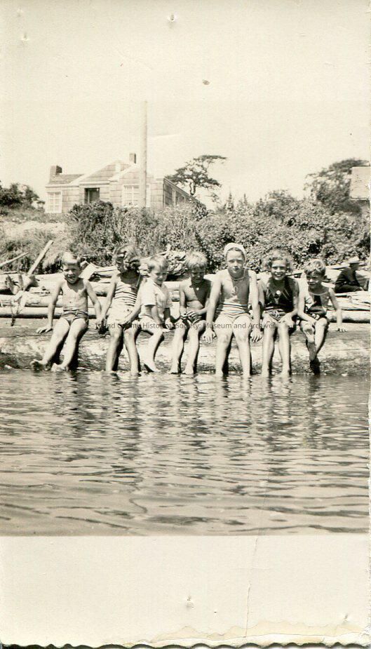 Digital copy of a black & white photo of a four boys and three girls in swimsuits sitting on a log on the shore. No description or date.