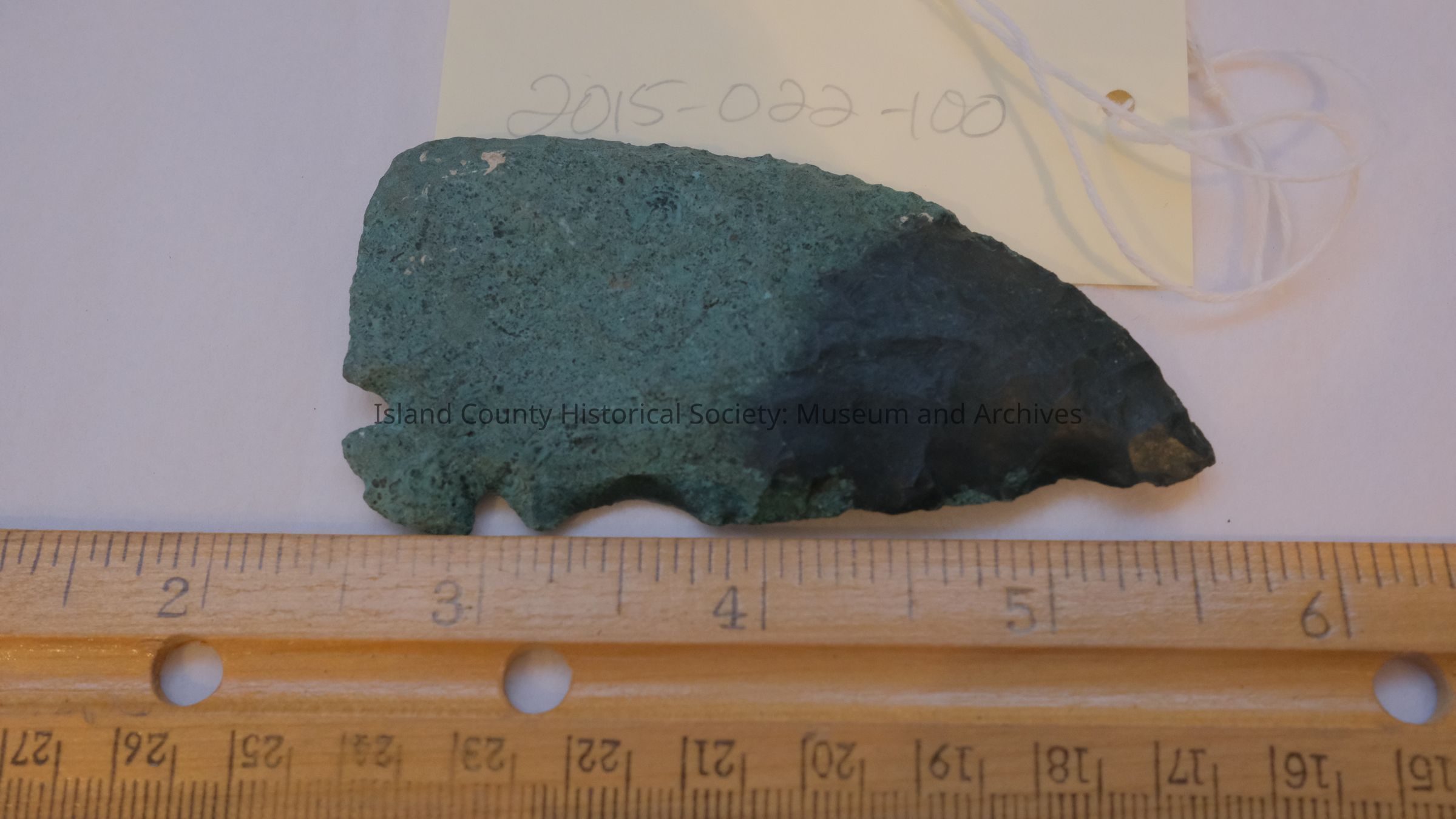 projectile or knife/scraper head, greenish in color and solid black toward tip, shape is unusual as it is partially triangular shaped with a side notched expanding stem one one corner of the object.Lexicon