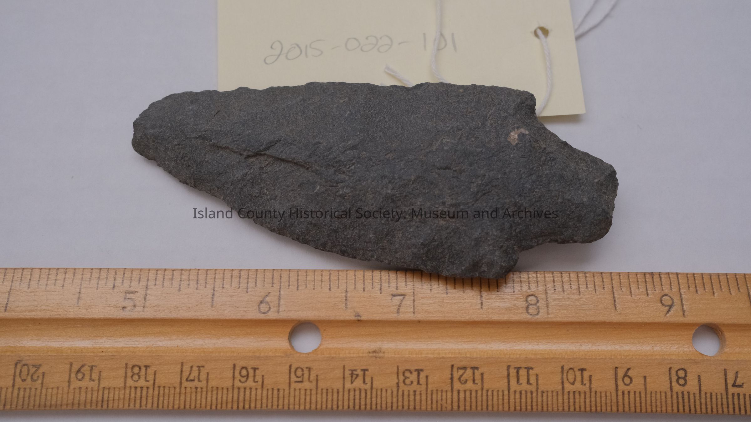 basalt projectile point, triangular blade, contracting stem with minimal straight shoulders
