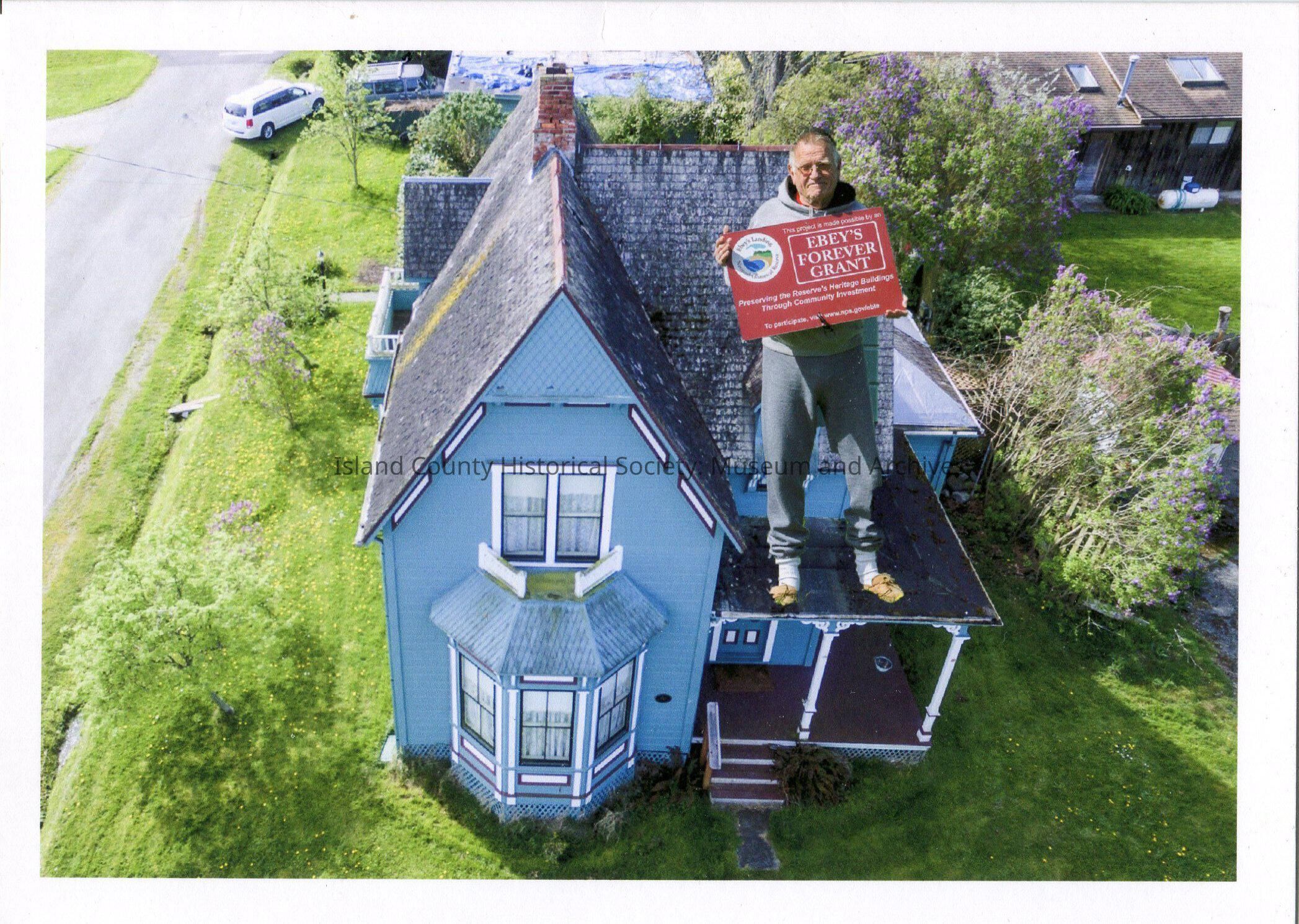 Digital copy only of a color photo of Ron Van Dyk superimposed on the porch roof a blue historic house in Coupeville - the Clapp House. He is wearing a gray hoodie sweatshirt and gray sweatpants. He is holding a placard that says, "Ebey's Forever Grant". He is wearing a gray hoodie sweatshirt and gray sweatpants. No date.