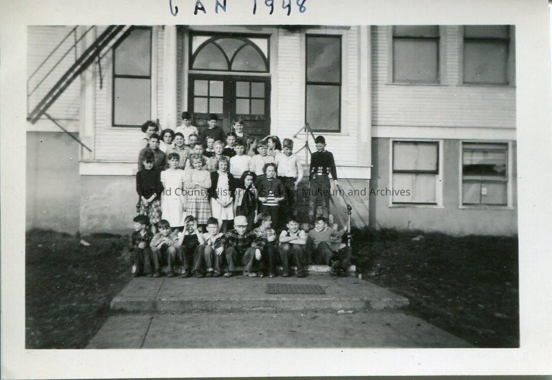 Digital copy only of a black & white group photo of school children sitting/standing on the steps in front of a school building. Jan 1948 is handwritten in the upper margin of the photo.