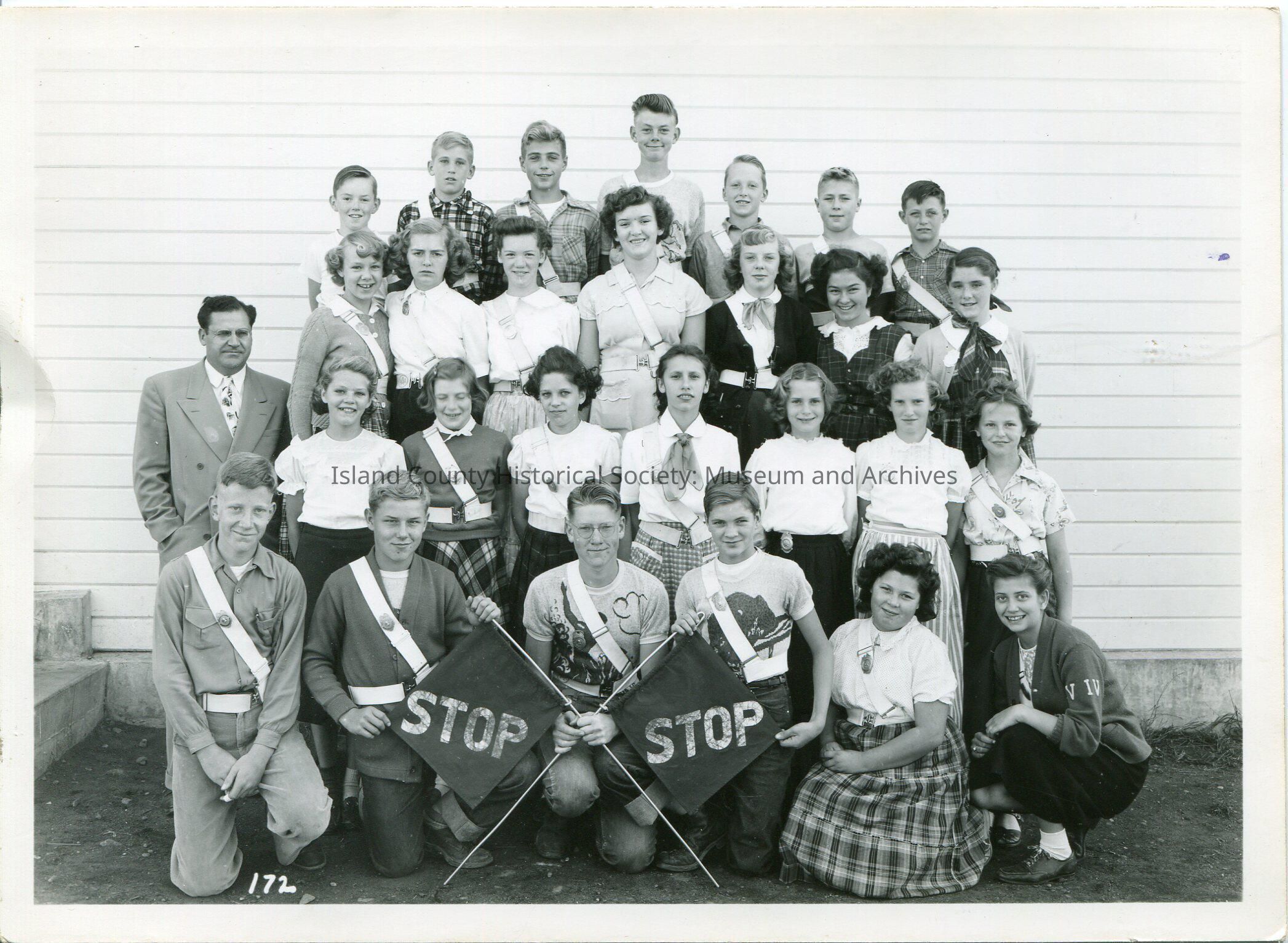 Digital copy only of a black & white group photo of school children sitting/standing in front of a white-sided school building. They are all wearing sashes and belts and appear to be school crossing guards. The teacher is standing on the far left in the second row; he is wearing a light colored suit & tie. Ron Van Dyk is third from the left in the front row. He is wearing glasses and holding two crossing flags saying "STOP". No date.
