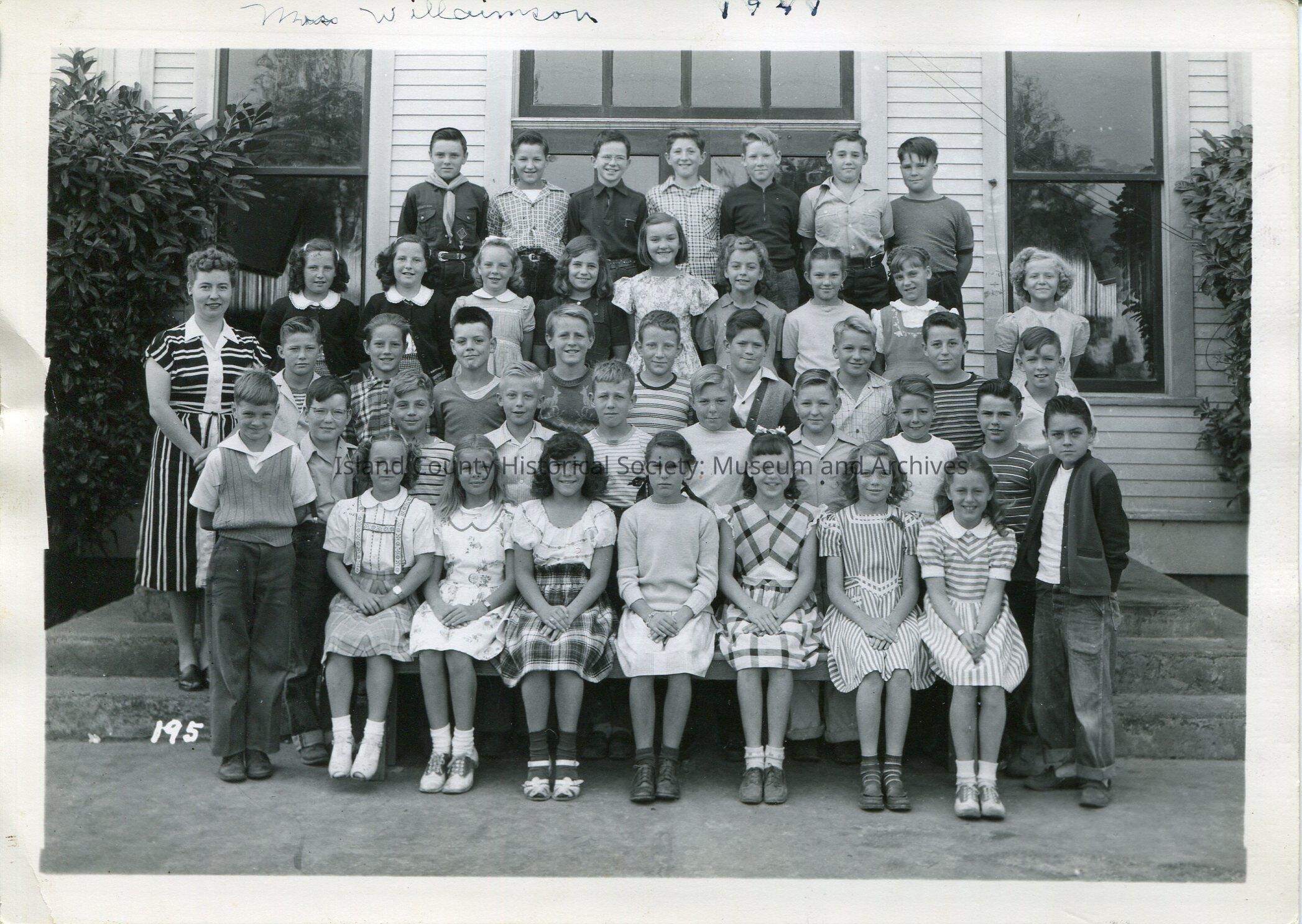 Digital copy only of a black & white group photo of school children sitting/standing on the steps in front of a school building. Their teacher is standing on the left side of the third row. She is wearing a striped dress. "Mrs. Williamson 1941" is handwritten in the upper margin of the photo. Ron Van Dyk is fifth from the left in the top row. He is wearing a dark polo shirt with a zipper. The number 195 is imprinted in the lower left.