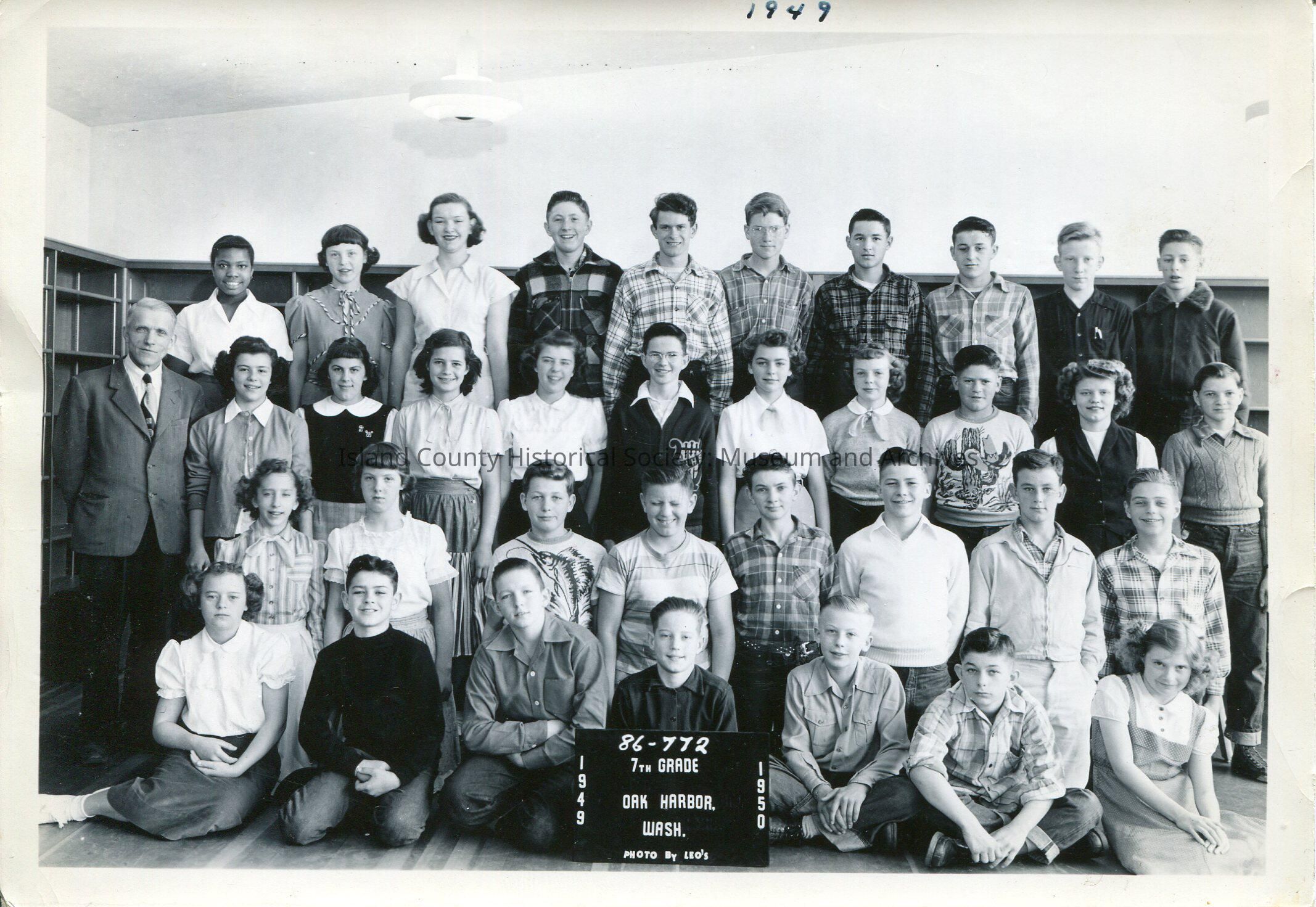 Digital copy only of a black & white group photo of school children sitting/standing in a classroom. Their teacher is standing on the left side of the third row. He is wearing a jacket & tie. Ron Van Dyk is sixth from the left in the top row. He is wearing glasses and a plaid shirt. "1949" is handwritten in the upper margin of the photo. The boy fourth from the left in the front row is holding a sign that says "86-772; 7th Grade; Oak Harbor Wash; 1949-1950.