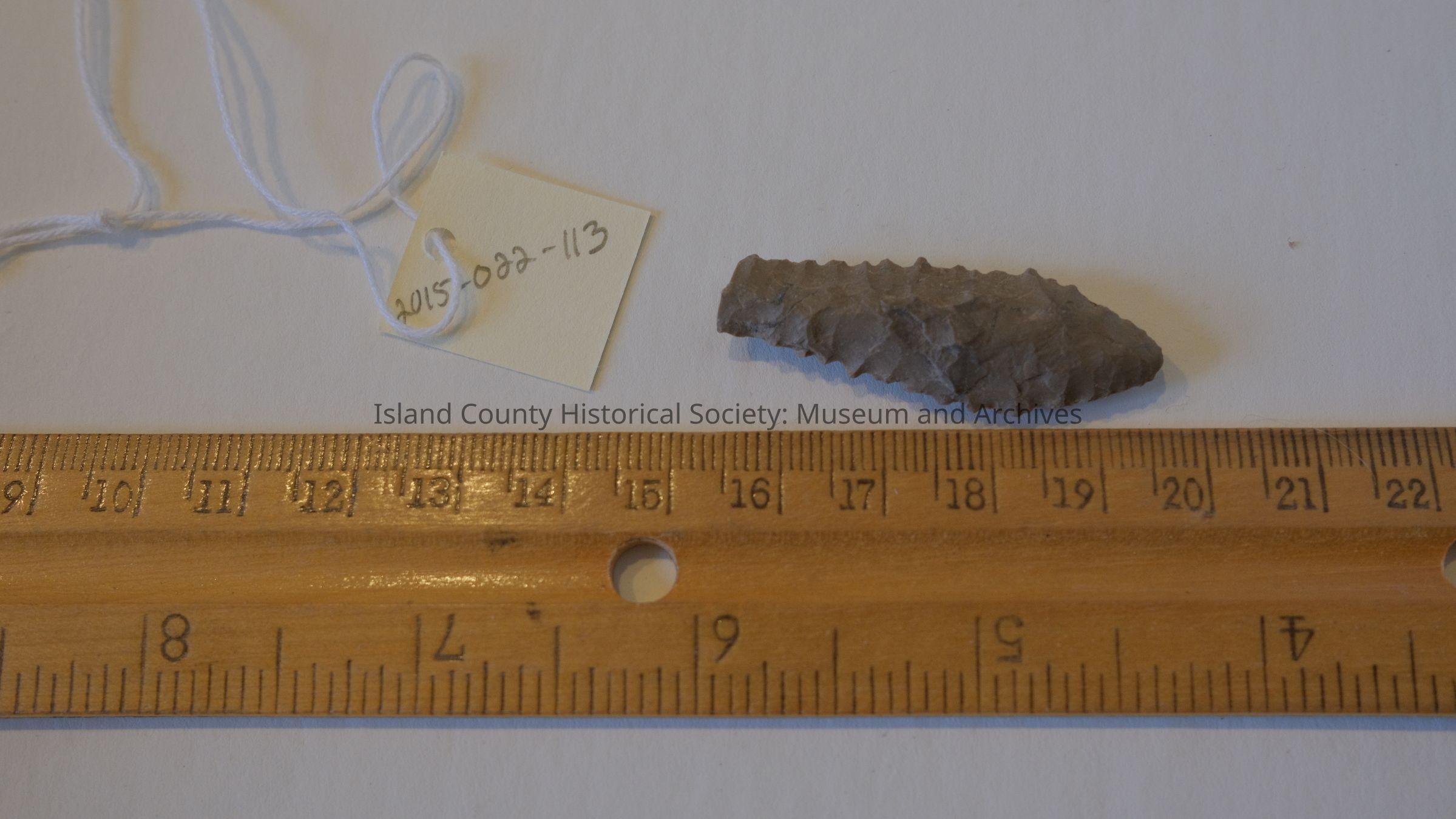 stone projectile point, elongated triangle blade with tip missing, serrated edges, contracting stem with convex base. brown in colorLexicon