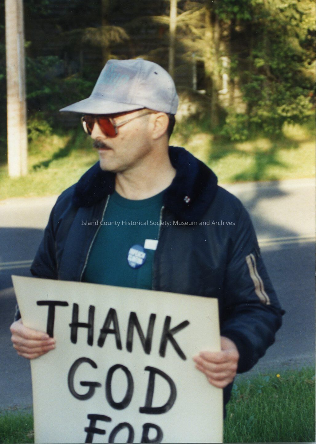 White male wearing a grey hat with sun glasses. He is wearing a bomber jacket with a forest green shirt with a blue button with text on it (unreadable). Holding a sign with the words "Thank God For..." visible. He is standing next to a road with trees in the background.