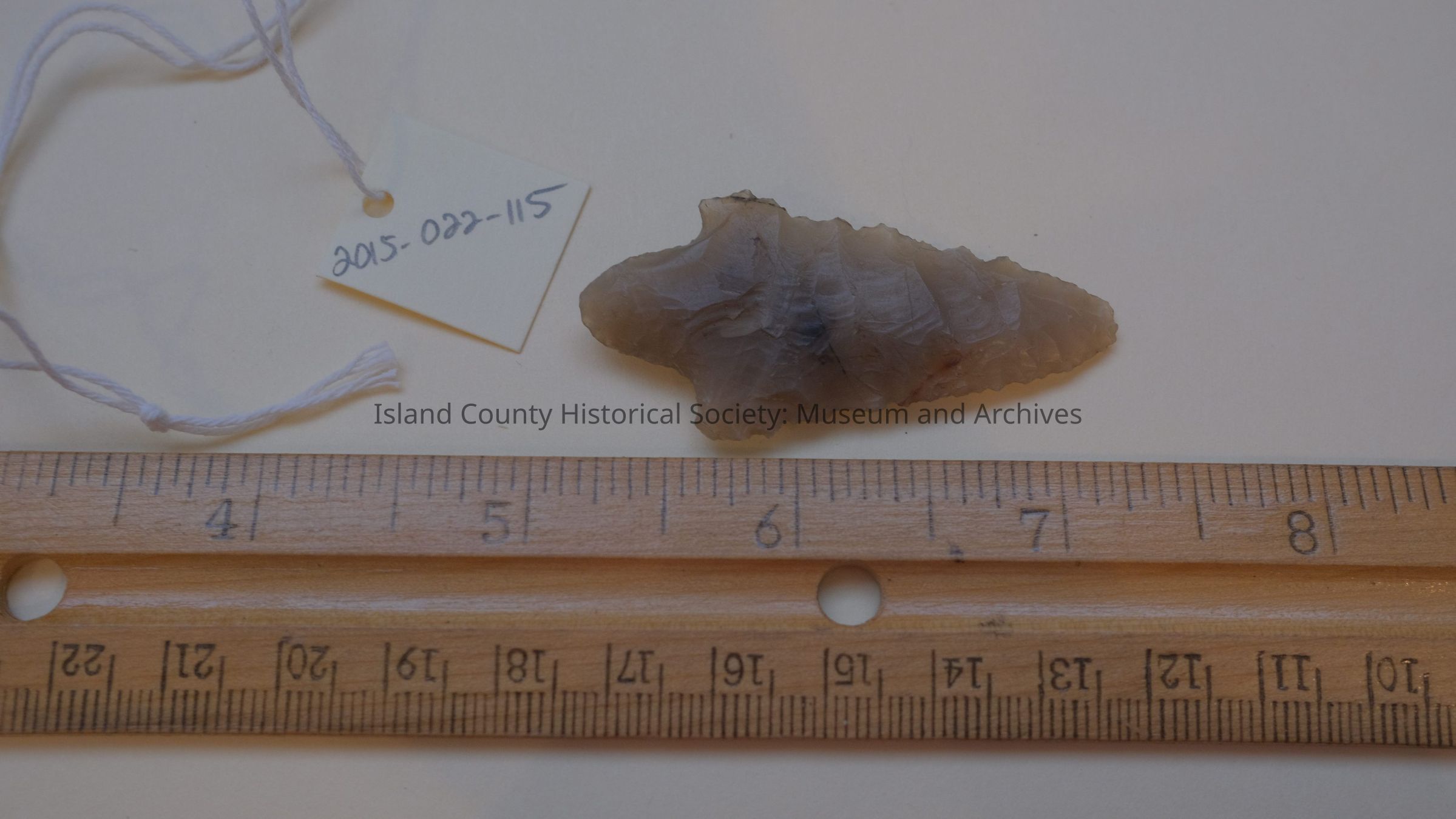 stone projectile point, triangular blade, serrated edges, contracting corner notched stem with convex base, brownish grey in color.Lexicon