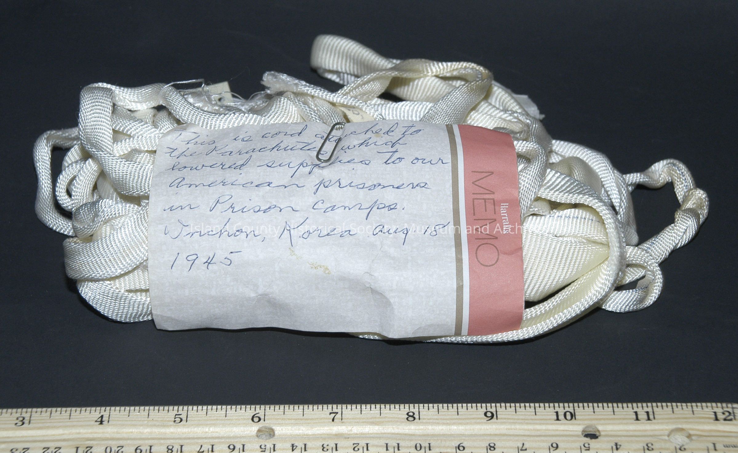 Parachute cord - white - was attached to the parachutes, which lowered supplies to American prisoners of war in prison camps. Inchon, Korea Aug. 18, 1945.