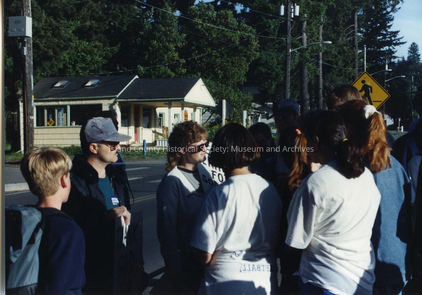 Protesters talking to a group of people. Protesters are a woman in a white sweater in sunglasses and a man in a grey hat with sunglasses and a bomber jacket. They are standing by a road with a pedestrian crossing sign in the background. Also in the background is a house.