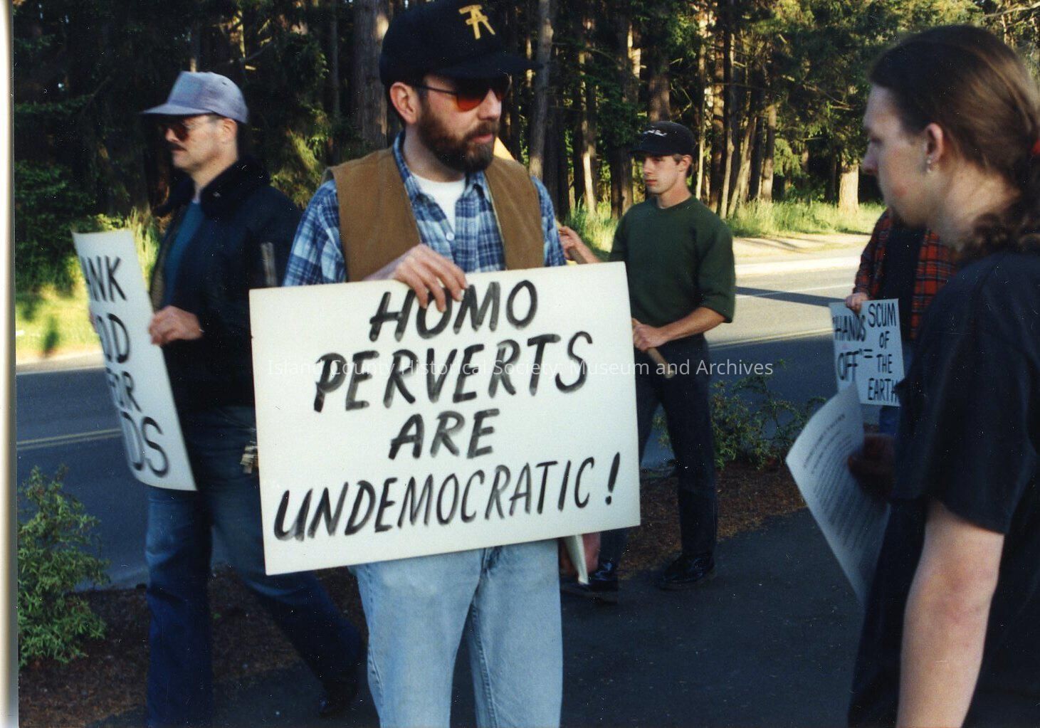 A male protester wearing a blue, plaid shirt with a hat and sunglasses is in the center of the photo. This protester is holding a sign that reads "Homo Perverts Are Undemocratic!" in black ink. This protester is also talking to a onlooker male whose hair is tied in a low ponytail. In the background seen are two other male protesters a man in a gray hat and sunglasses with a bomber jacket and a younger man wearing a green sweater and black hat carrying what looks to be a flag.