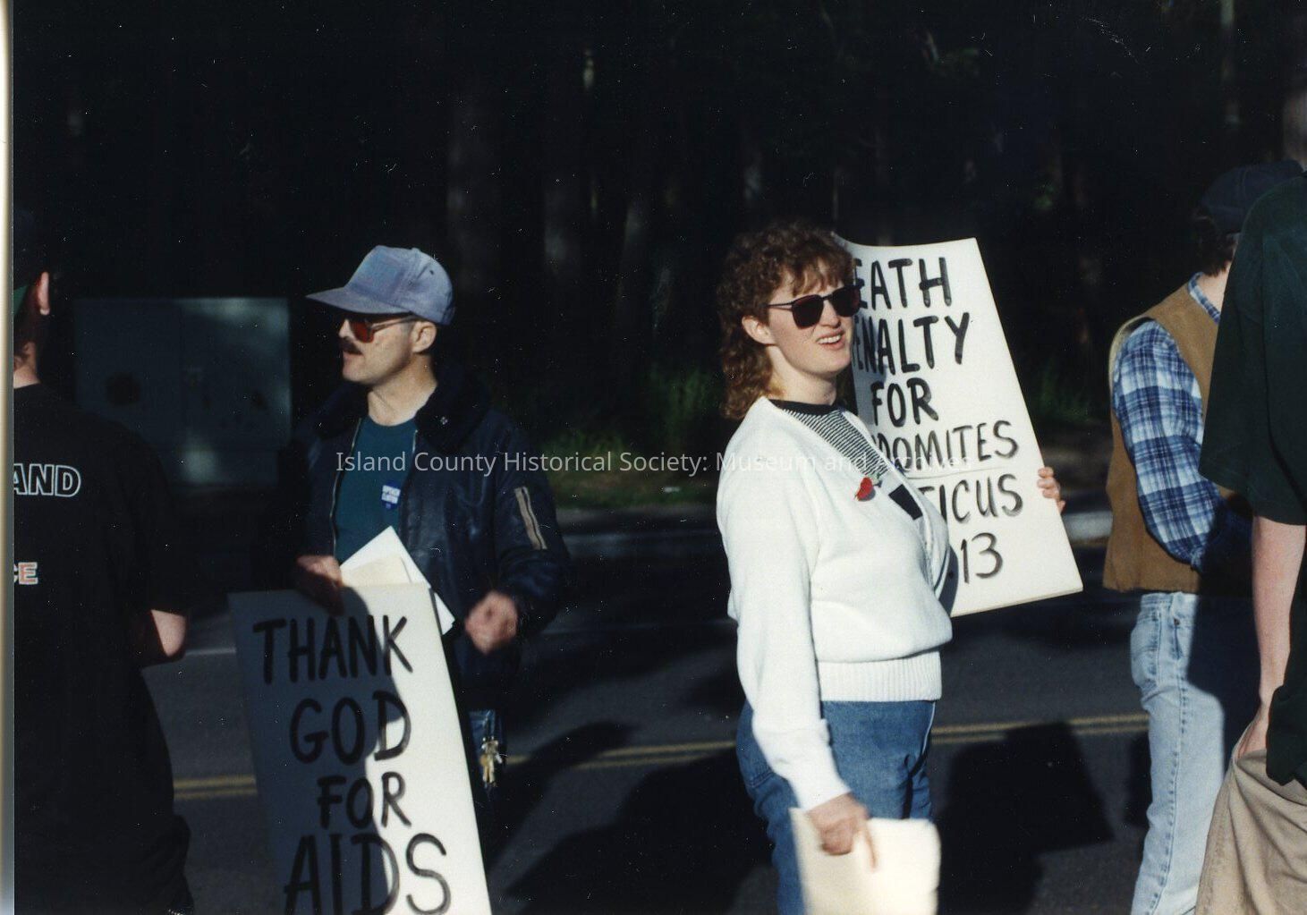Two protesters are visible holding signs. One protester is male and the other is female. The female is wearing a white sweater and is holding a sign that the visible part says "Death Penalty for Sodomites" and a folder in another hand. The male is wearing a gray hat with sunglasses and bomber jacket holding a sign that says "Thank God For Aids". Both are standing next a road.