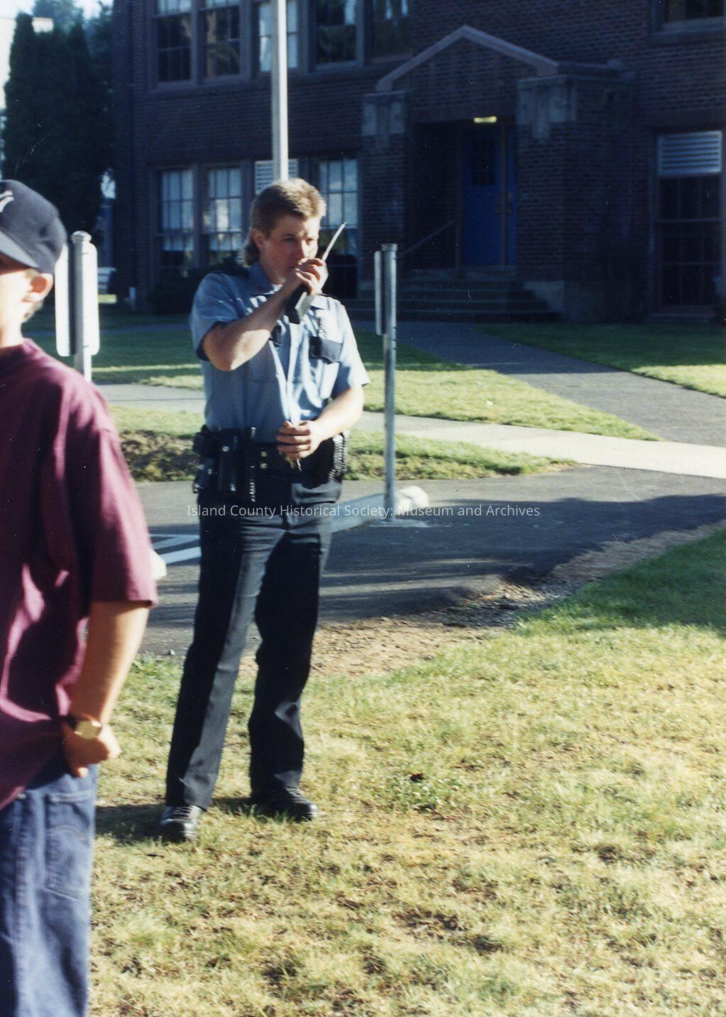 Male, white police officer with a mullet is speaking on his walkie. He is standing in a grassy area that is near some parking in front of the old Langley high school. On the left side of the photo there is a younger male who is wearing a blue hat with a maroon shirt and jeans and is wearing a wrist watch.