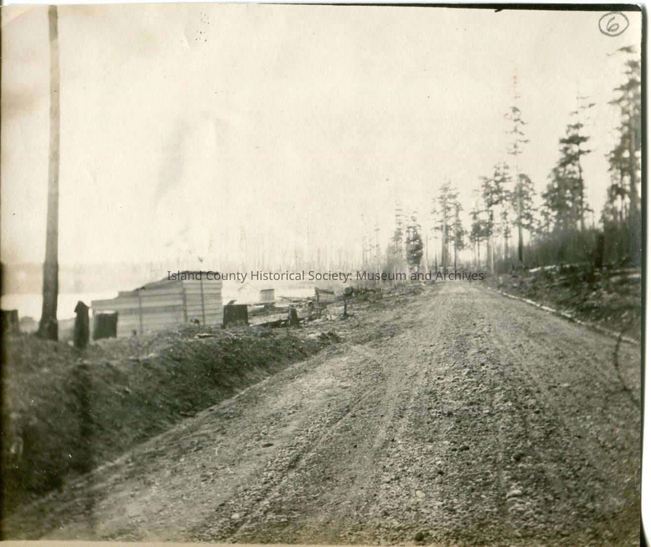 Photo description on the back states: "Along south side of Hastie Lake. On the front of the photo a number 6 is written with a circle. Shows early travel on Whidbey Island dirt roads with shack structure next to the road. Appears to be a stretch of road along a body of water.