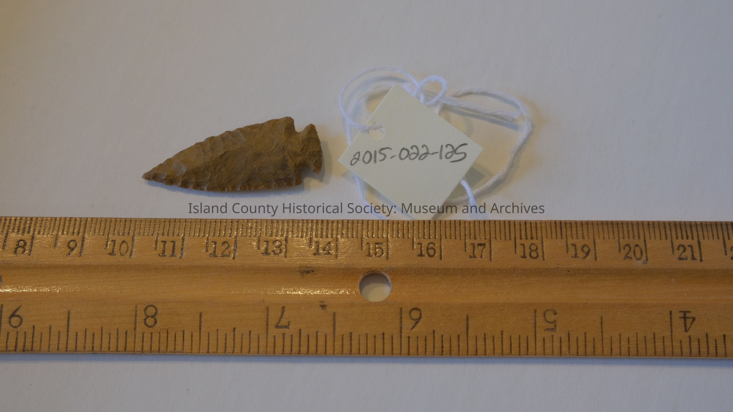 stone projectile point, triangular blade, corner notched expanding stem with slightly convex base, brown in colorLexicon
