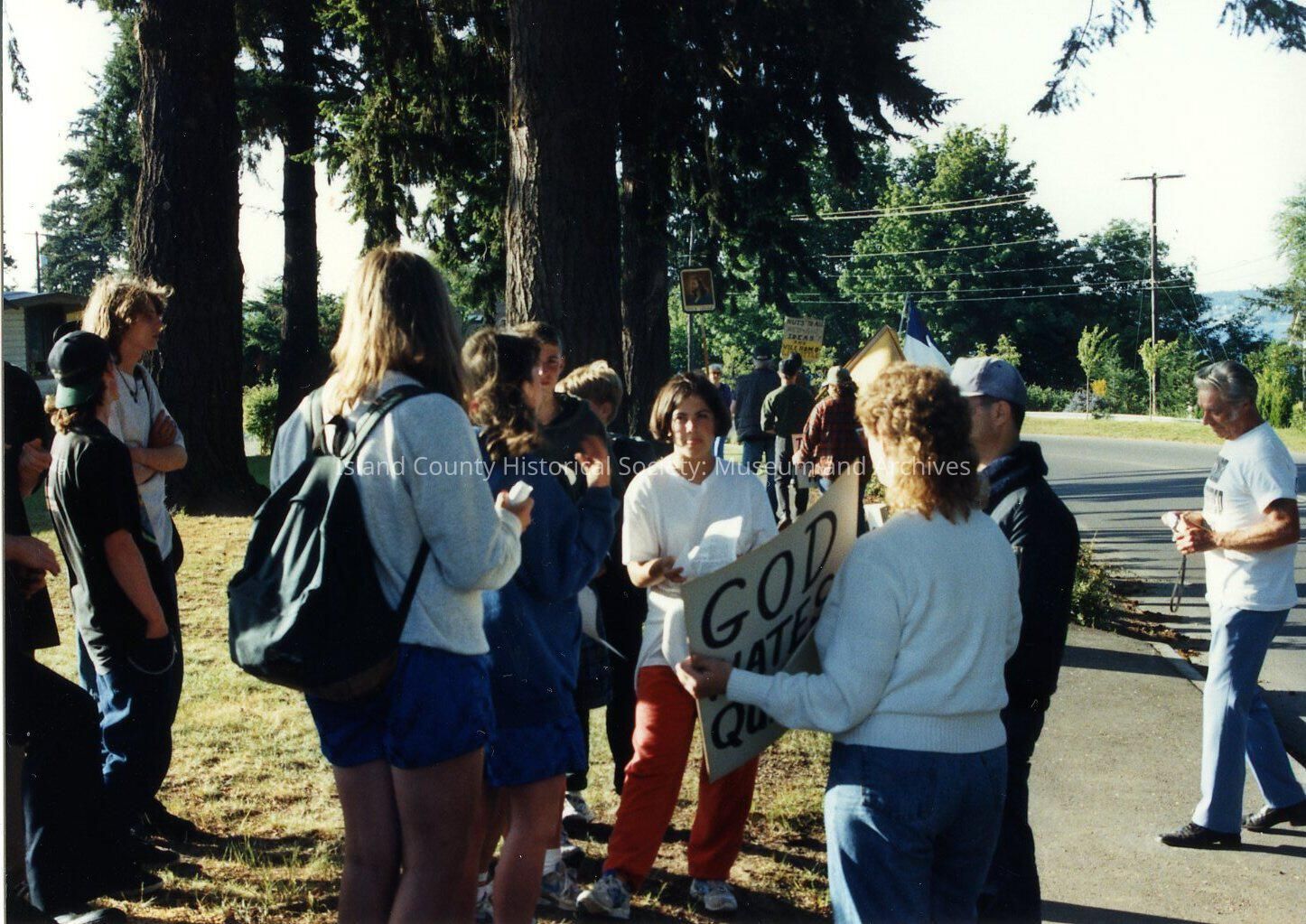 Group of people listening to protesters. One of the protesters shown in a white female in a white sweater who is holding a sign that says "God Hates Qu..." (rest is blocked by her arm) with her back facing the camera. In the background you can see more protesters with signs the one that is most visible is the image of Jesus.